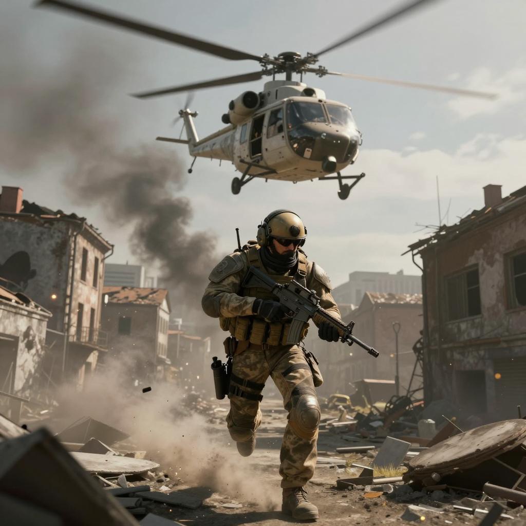 A hyper-realistic image of a soldier in tactical military gear sprinting through a destroyed urban street with debris and smoke. The soldier is equipped with advanced armor, a compact submachine gun, and communication headset. A helicopter is hovering overhead in a war-torn European city with shattered buildings visible on both sides. The scene is captured with dynamic cinematic lighting and detailed special effects like sparks and smoke, depicting a combat zone insertion.