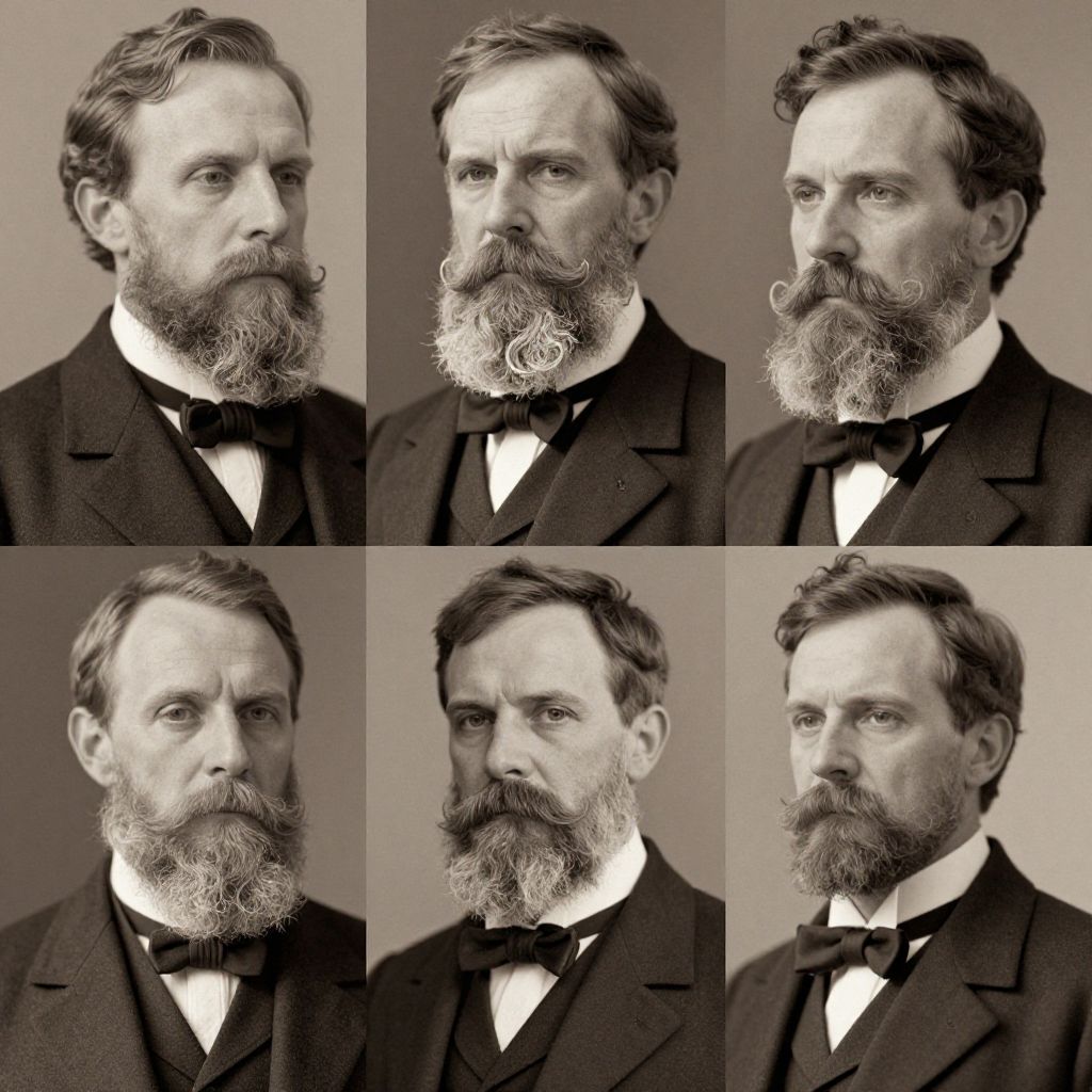 Beard images style focusing on vintage Victorian era beards with curled mustaches, detailed grooming, sepia tone filter, classic suits, and elegant old-world setting, capturing historical sophistication and timeless masculinity in high resolution.