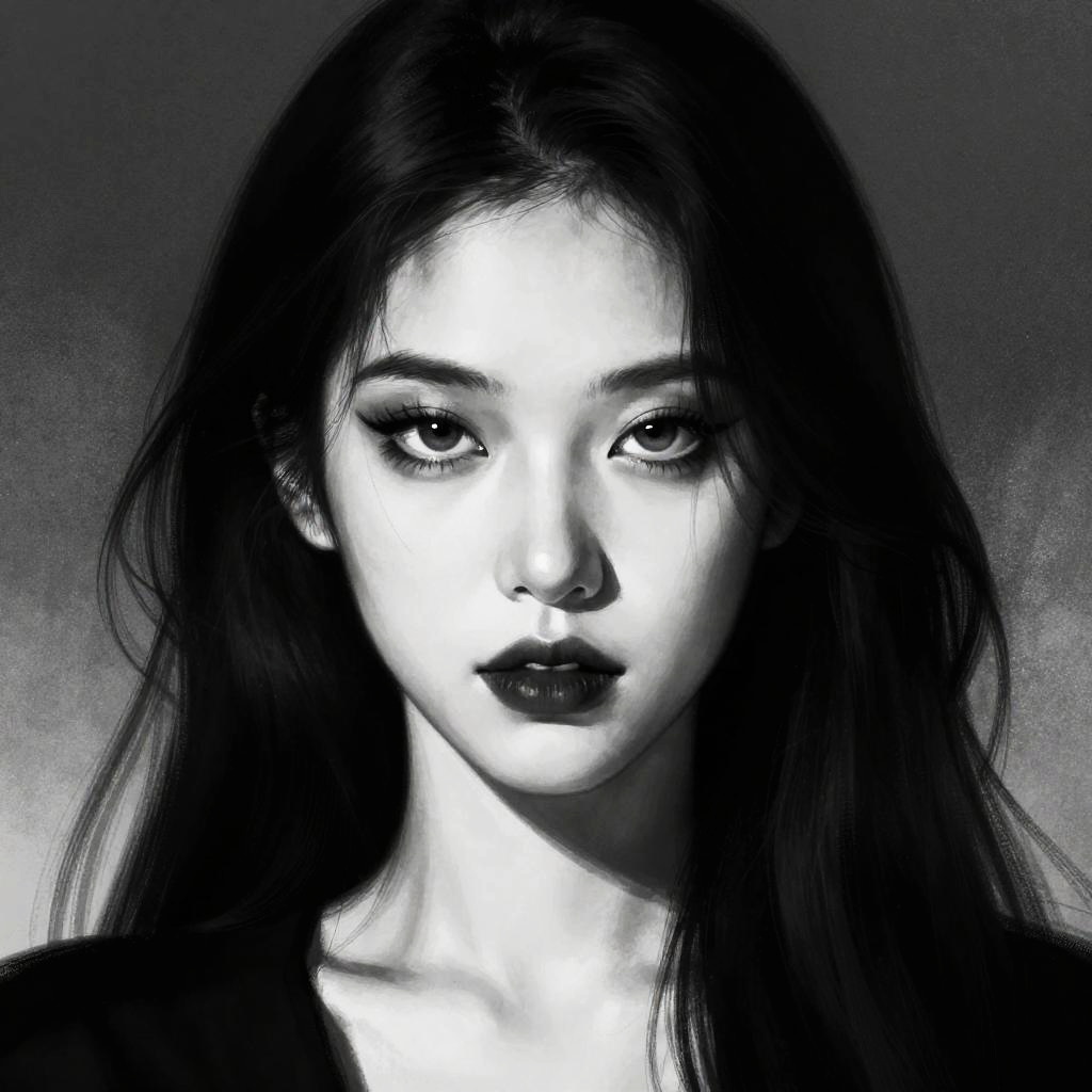 A high-contrast, black-and-white digital drawing of a mysterious woman with dark hair and striking features. Her face is slightly turned, casting a dramatic shadow over her right side, while her left side is brightly illuminated, highlighting her sharp eyes and dark lipstick. The background is a textured, sparkly gradient, adding depth and intrigue to the overall image.