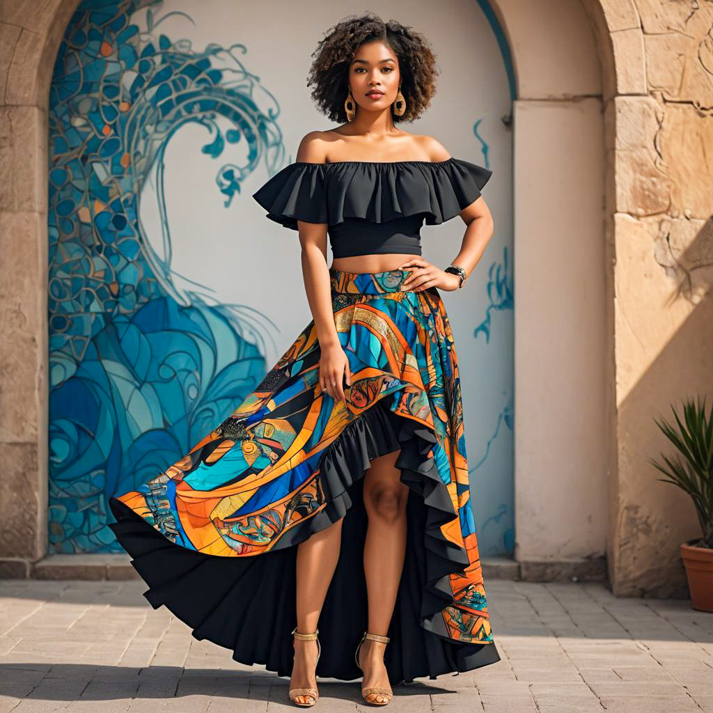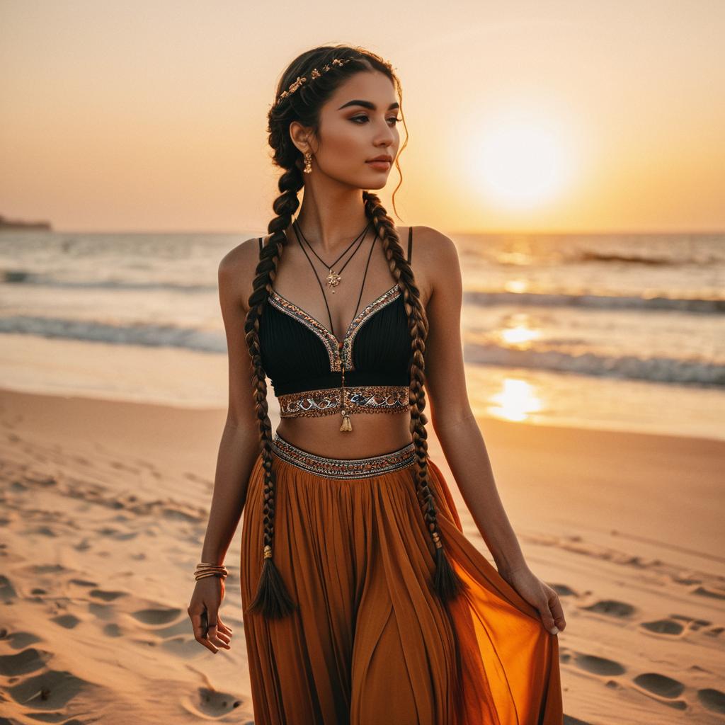 Young woman Low Waist, Long Straight, belly dancer outfit, fringed crop top, wrap skirt with floral patterns, vintage soft focus
