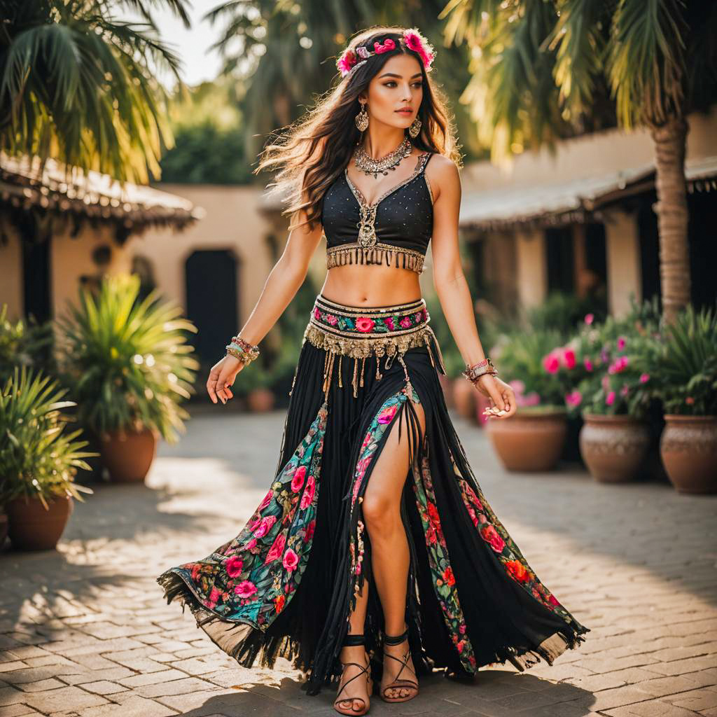 Portrait of a young woman wearing a fringed crop top and a long wrap skirt with vibrant floral patterns in a belly dancer outfit. The woman poses gracefully outdoors on a dirt path surrounded by lush greenery during golden hour light. She has long straight hair adorned with a flower and traditional jewelry including necklace, earrings, and bangles.