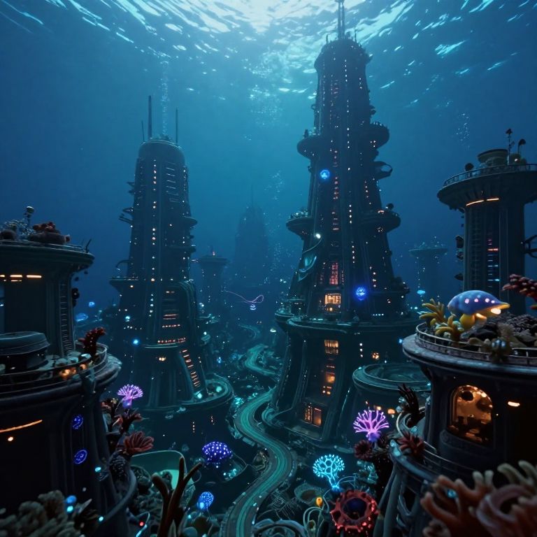 A surreal underwater metropolis emerges from the depths of an immense ocean, with towering skyscrapers reaching towards light filtering through dark, swirling waters. From a unique perspective, observe the intricate details of this mysterious world as bioluminescent sea creatures illuminate hidden corridors and secret chambers within these submerged structures. The fusion of human-made architecture with the organic beauty of marine life creates an emotional gradient that ranges from awe to curiosity, inviting viewers to explore the uncharted depths of this dreamlike blend between reality and fantasy.