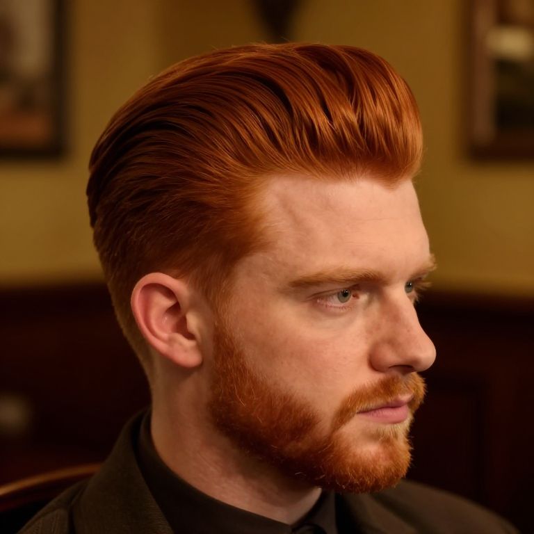 Irish hairstyles male, vintage inspired look with slicked back red hair and side part, light stubble beard, warm tones, cozy Irish pub interior setting, cinematic lighting, depth of field focusing on hairstyle