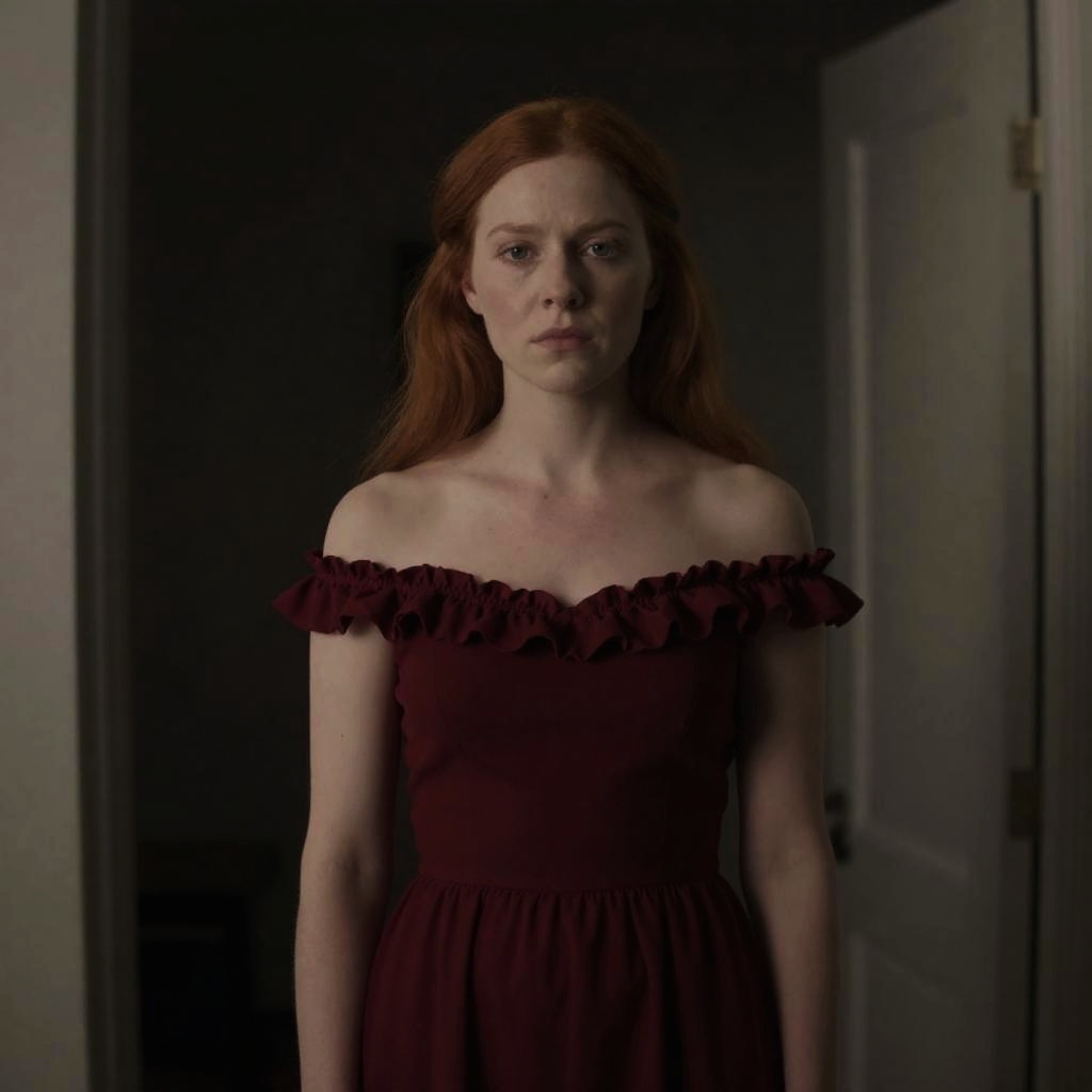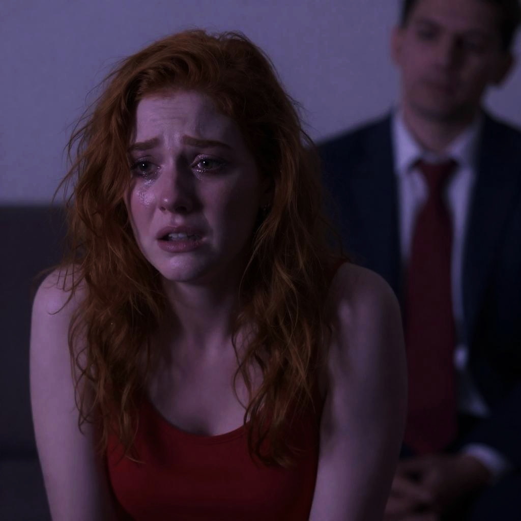 Close-up of a distressed young woman with messy red hair and teary eyes wearing a red sleeveless top, leaning forward with an intense expression. In the blurred background, a man in a dark suit and red tie sits, partially out of focus. The scene is illuminated with dim, purple lighting.