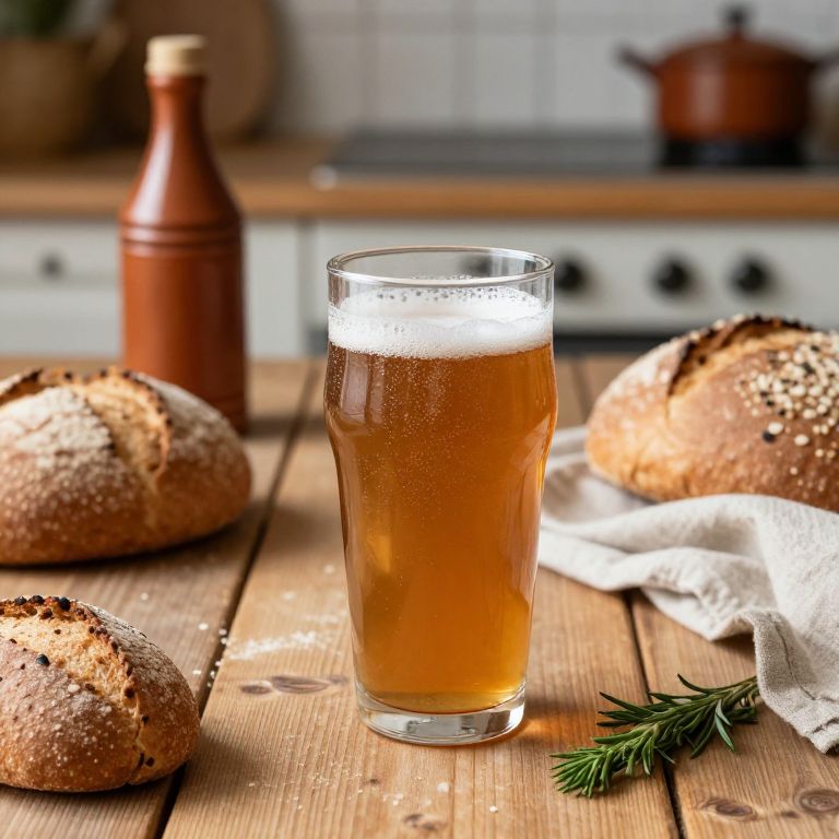 Kvass on a rustic wooden table, surrounded by traditional Eastern European breads and herbs, warm natural lighting emphasizing the amber color and fizz of the fermented beverage, cozy kitchen background with vintage ceramic bottles and a linen cloth.