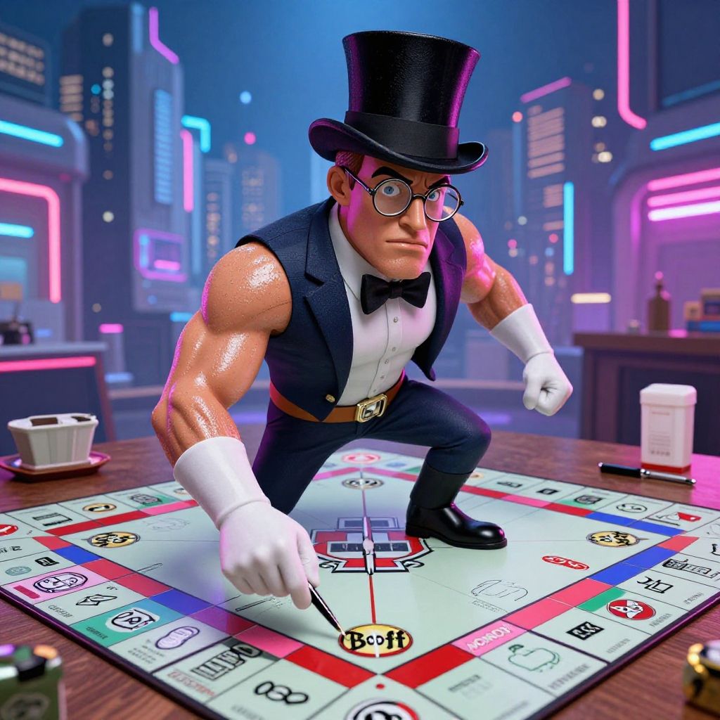 Buff Monopoly Man posed heroically on a giant Monopoly board, muscles glistening under neon lights, wearing iconic top hat and monocle, futuristic cityscape background, cyberpunk art style, detailed character design, intense expression, vibrant colors.