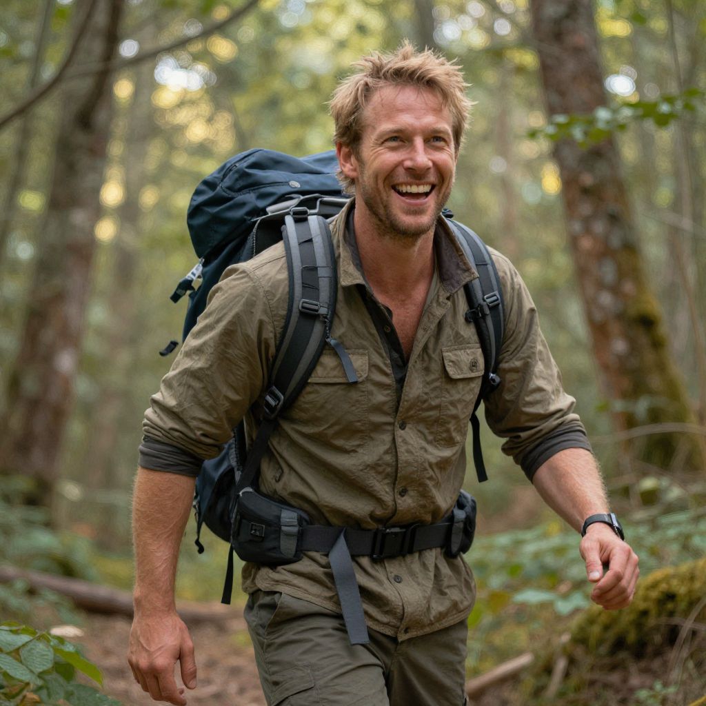 A man, soft flannel button-up shirt, deep forest plaid, rugged hiking pants, trail-ready boots, serene creek, moss-covered rocks, vibrant ferns, cameraphone style, relaxed smile, enjoying nature. Man has masculine face and piercing eyes