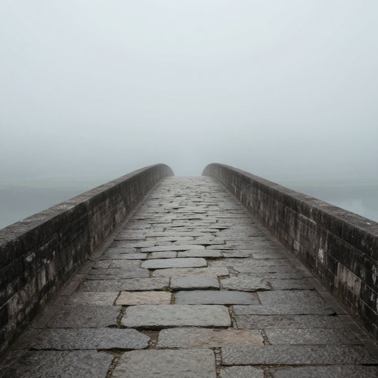 Photograph of a foggy stone bridge extending into a misty, white horizon, with dark, weathered stone slabs and brick sides.