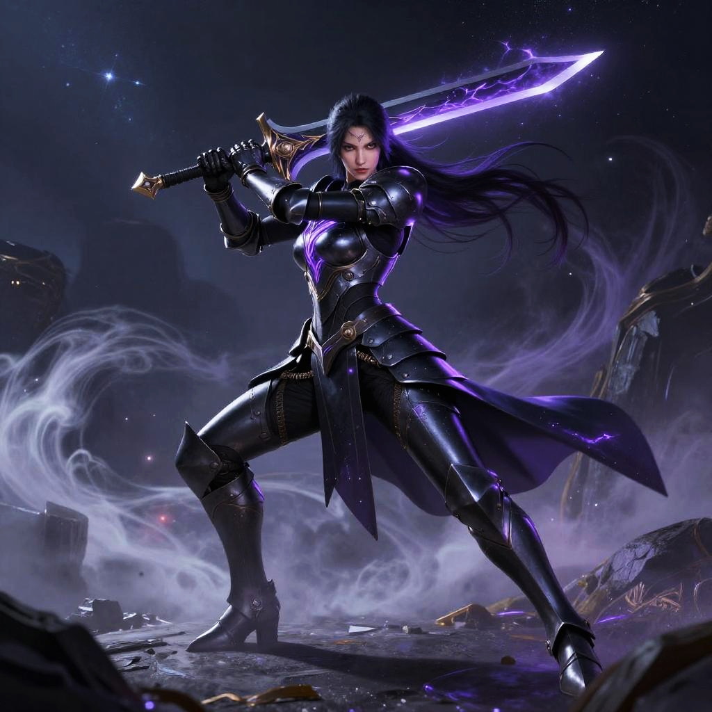 Void elf female warrior in battle stance, wielding a dark energy blade, sleek midnight black armor with glowing violet highlights, surrounded by a swirling void mist, futuristic fantasy setting with stars and cosmic elements, dynamic pose