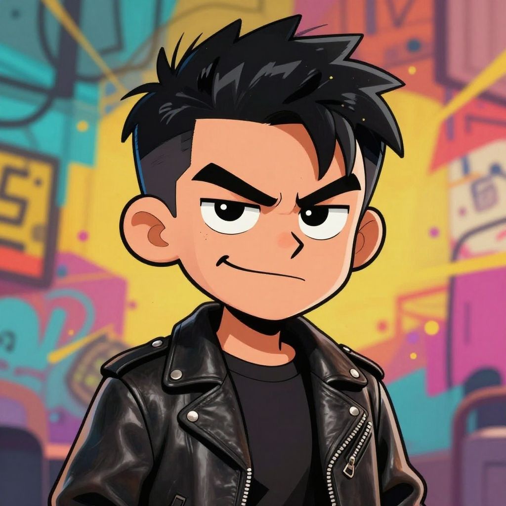 A stylish cartoon character with a condescending smirk, raised eyebrow, wearing a leather jacket, urban graffiti background, vibrant colors, dynamic composition