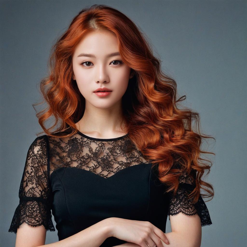 Photorealistic portrait of a young Asian woman with long, red curly hair wearing a black dress with see-through lace sleeves. She has brown eyes, subtle makeup, and a slight head tilt, looking directly at the viewer with a closed mouth expression.