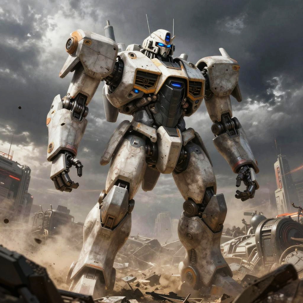 Realistic epic robot drawing, colossal robot emerging from a futuristic battlefield, worn armor with battle scars, moody stormy sky, dust and debris swirling, highly detailed mechanical joints, realistic shading and highlights
