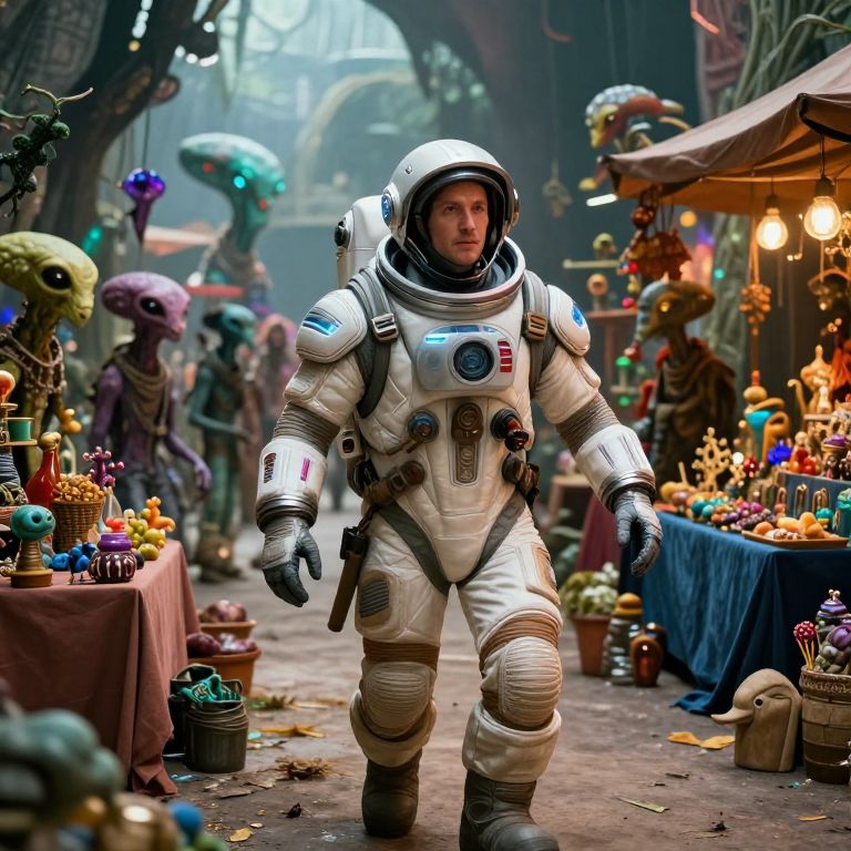 Photorealistic CGI: Astronaut in white spacesuit walks through colorful, alien-themed market with bizarre creatures, glowing decorations, and stalls.