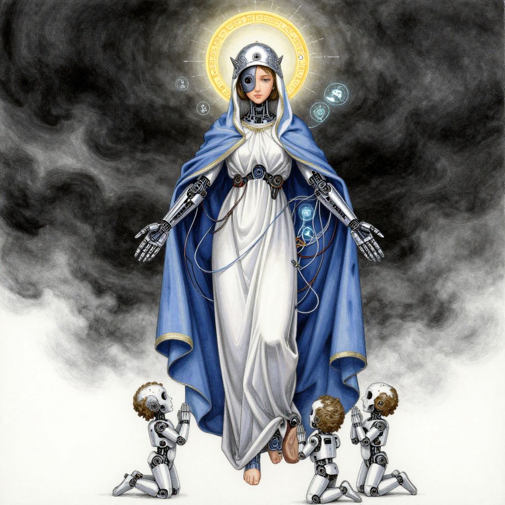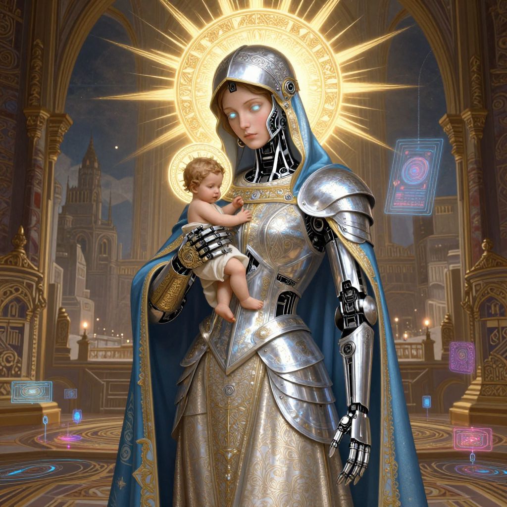 Digital artwork of a cyberpunk Virgin Mary in silver armor holding baby Jesus, with glowing halo, futuristic cathedral backdrop, and holographic icons.