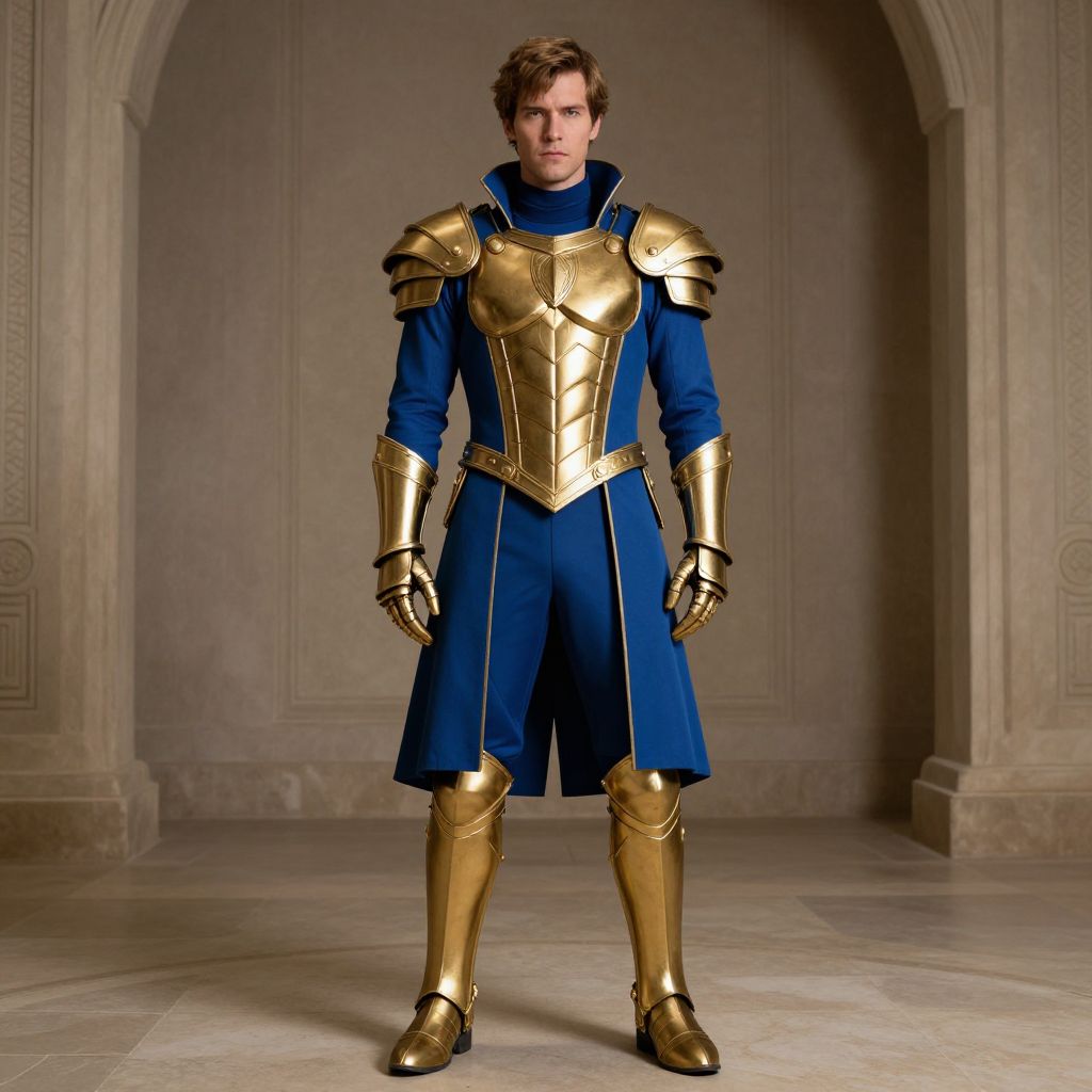 Photograph of a Caucasian man with short brown hair, standing in a stone archway. He wears a medieval-style blue and gold armor suit, with a long blue tunic and gold breastplate, shoulder guards, gauntlets, and boots. The armor has a shiny, metallic texture. The background features stone walls with ornate carvings, and a smooth, light-colored stone floor. The man's expression is serious, and he stands in a frontal pose, hands by his sides. The lighting is even, highlighting the armor's gleam and the blue tunic's rich color.
