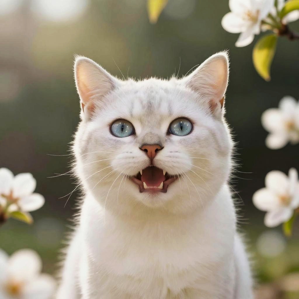 White cat smile, playful and charming with sparkling eyes, surrounded by blooming garden flowers, gentle sunlight filtering through leaves, realistic fur texture, cheerful vibe