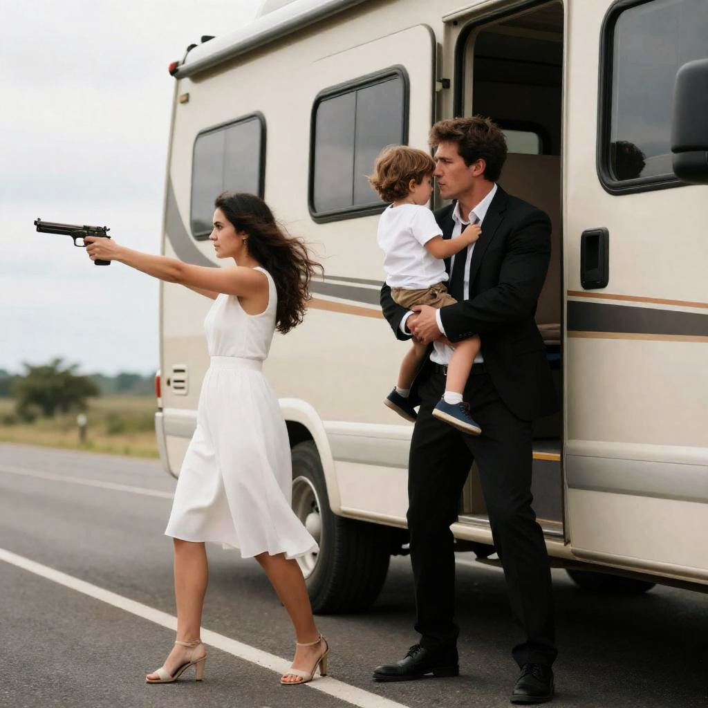 Photograph of a tense scene. Man in black suit with child in arms, being pushed out of moving beige RV by woman in white dress. Woman aims gun at man. Road with white stripes, cloudy sky background.