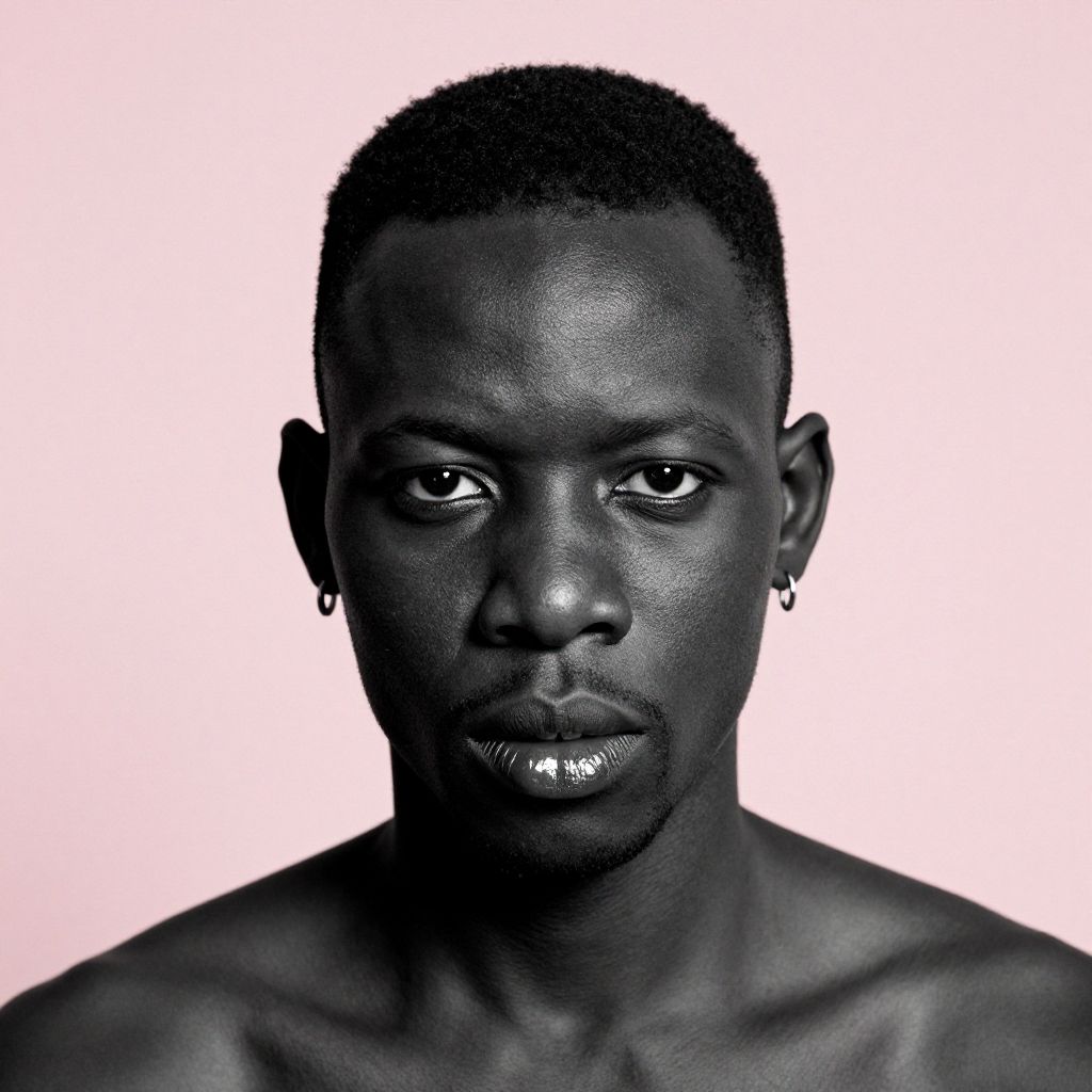 A stark, high-contrast portrait of a malian man with sharp facial features and a flat-top hairstyle, His skin is rendered in deep monochrome tones, emphasizing texture and shadow, while the background is a soft pastel pink, creating a striking juxtaposition, The subject’s expression is intense and introspective, with gleaming highlights on his lips and earrings, The composition is minimalist yet bold, with a retro-modern aesthetic, chromatic grain texture