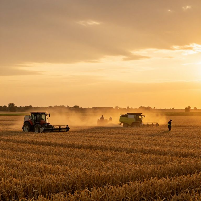 Photograph of a golden sunset over a vast wheat field. Three large farming machines, including a red tractor on the left and two combine harvesters in the center and right, are actively harvesting. Dust clouds rise from the machinery as they move through the tall, golden wheat. A lone farmer stands near the right combine harvester, dressed in dark clothing and a hat. The horizon is lined with a distant tree line, and the sky is filled with warm, orange and yellow hues. The overall scene is serene and picturesque.