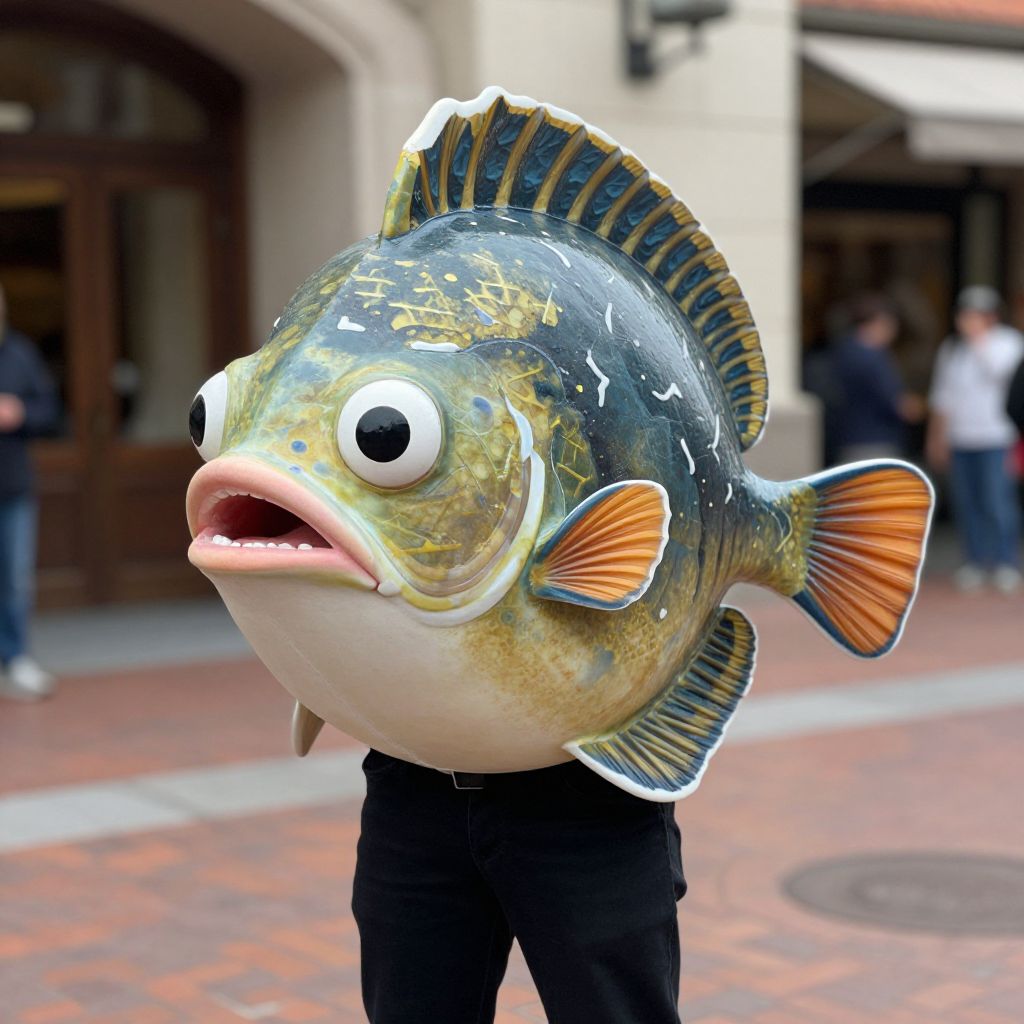 "Disney Flounder Adult, man in a fish mask standing on a street"