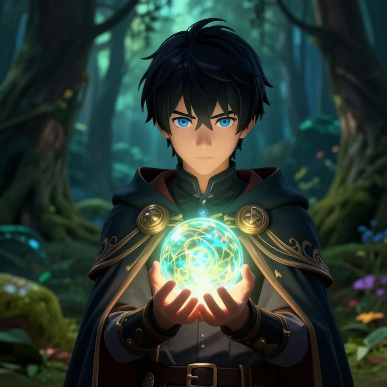 Black haired blue eyed anime boy in a fantasy forest setting, wearing a cloak with intricate designs, holding a glowing magical orb in his hands, mysterious and adventurous gaze, enchanted woodland background, rich textures and vibrant colors, fantastical ambiance.