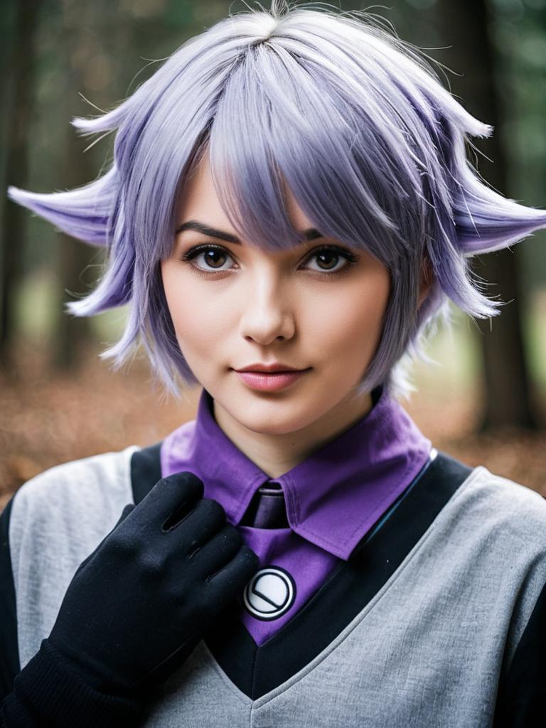 Photo-realistic cosplay photo of person in amethio (pokemon) costume. 1boy, purple eyes, white pupils, symbol-shaped pupils, eyelashes, two-tone hair, short hair, black hair, grey hair, loose hair strand, collared shirt, grey shirt, black gloves, neck ribbon, long sleeves, purple gemstonelifestyle stock photo, shallow depth of field, lifestyle stock photography, shallow depth of field, natural lighting, warm tones, soft background blur, candid moments, vibrant colors, realistic textures, modern casual clothing. full body shot