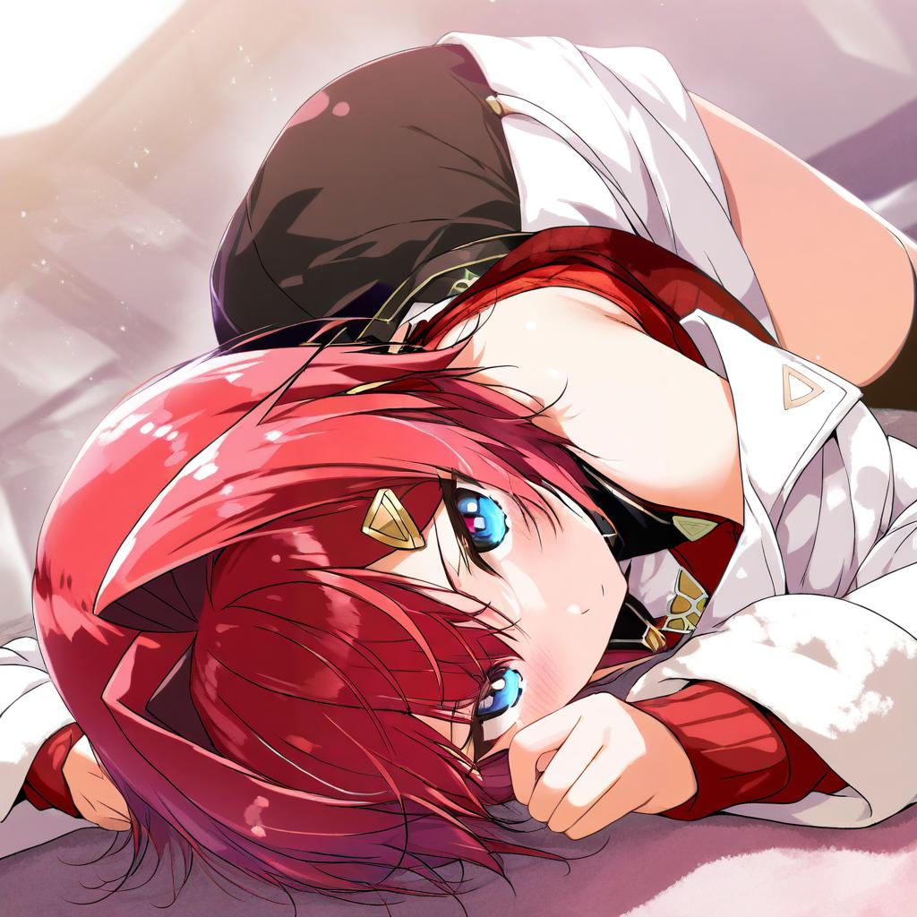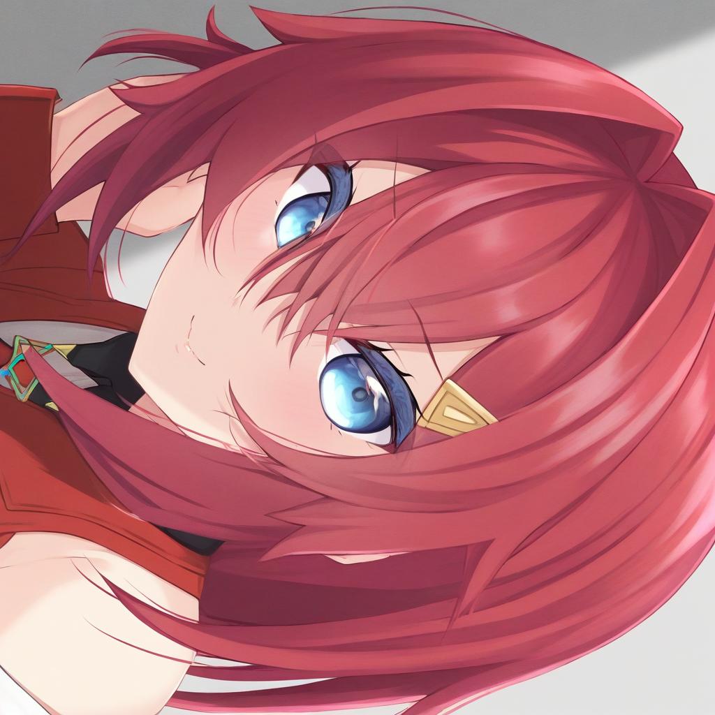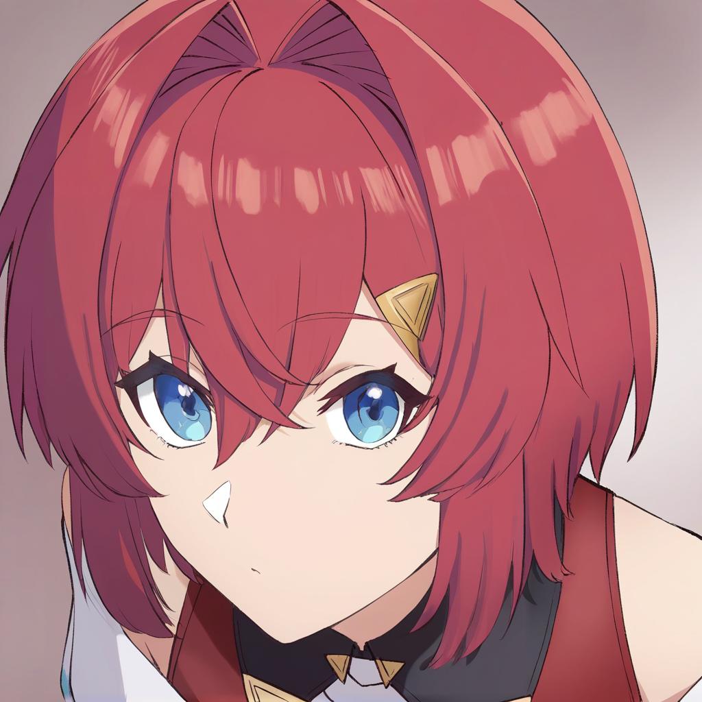 Ange katrina (1st costume), nijisanji, 1girl, blue eyes, hair between eyes, red hair, short hair, hair intakes, hairclip, long sleeves, off shoulder, virtual youtuber, virtual youtuber, by artist ishii hisao, leet