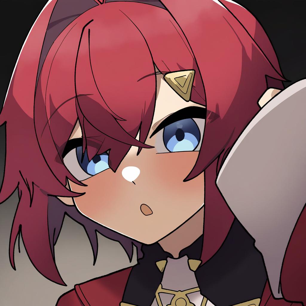 Close-up digital illustration of a virtual YouTuber with short red hair, blue eyes, and a small triangular hairclip on the side. The character wears an off-shoulder long-sleeve top with black and red colors. The anime-style drawing features detailed eye highlights and soft shading.