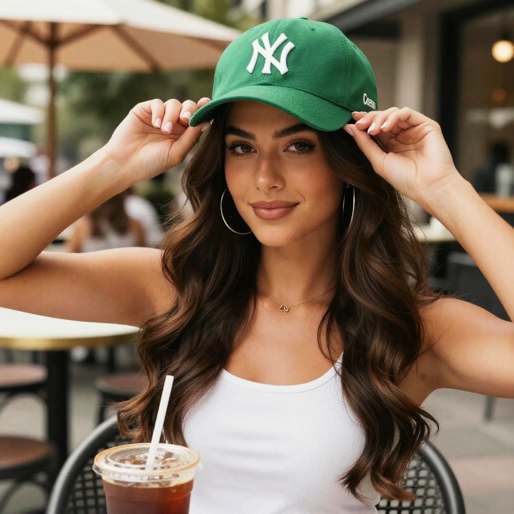 Photograph of a young woman with long, wavy brown hair, wearing a green New York Yankees cap, white tank top, and large hoop earrings. She has a light olive skin tone and is smiling slightly while adjusting her cap with both hands. In front of her on the table is a clear plastic cup with a straw and iced drink. The background is a blurred outdoor café setting.