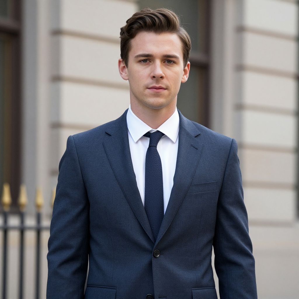 Photograph of a young, handsome white man with short brown hair in a dark blue suit, white shirt, and black tie, standing in front of