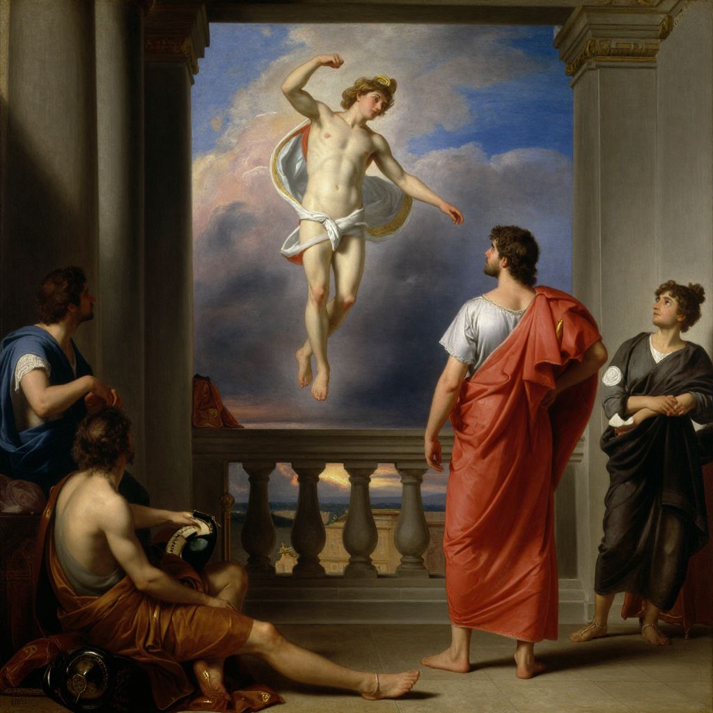 This digital illustration in a classical style depicts a mythological scene. At the center, a nude, fair-skinned male angel with curly blond hair and a muscular build hovers in mid-air, wearing a white loincloth and holding a circular object. He gazes downward. Four men, dressed in ancient Roman-style togas in shades of blue, red, and black, stand and sit around him, gazing in awe. They are positioned in a grand, columned room with a stone balcony and a cloudy sky in the background. The men have various physiques, with one muscular and another more slender. The scene is illuminated by soft, natural light, highlighting the dramatic and divine atmosphere.