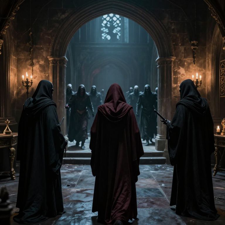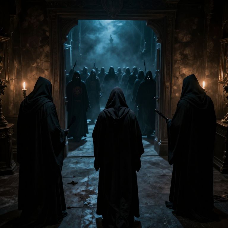 Bumpy 3 necromancers, in an old room, opening a port to hell where the army of death can be seen walking into the room,