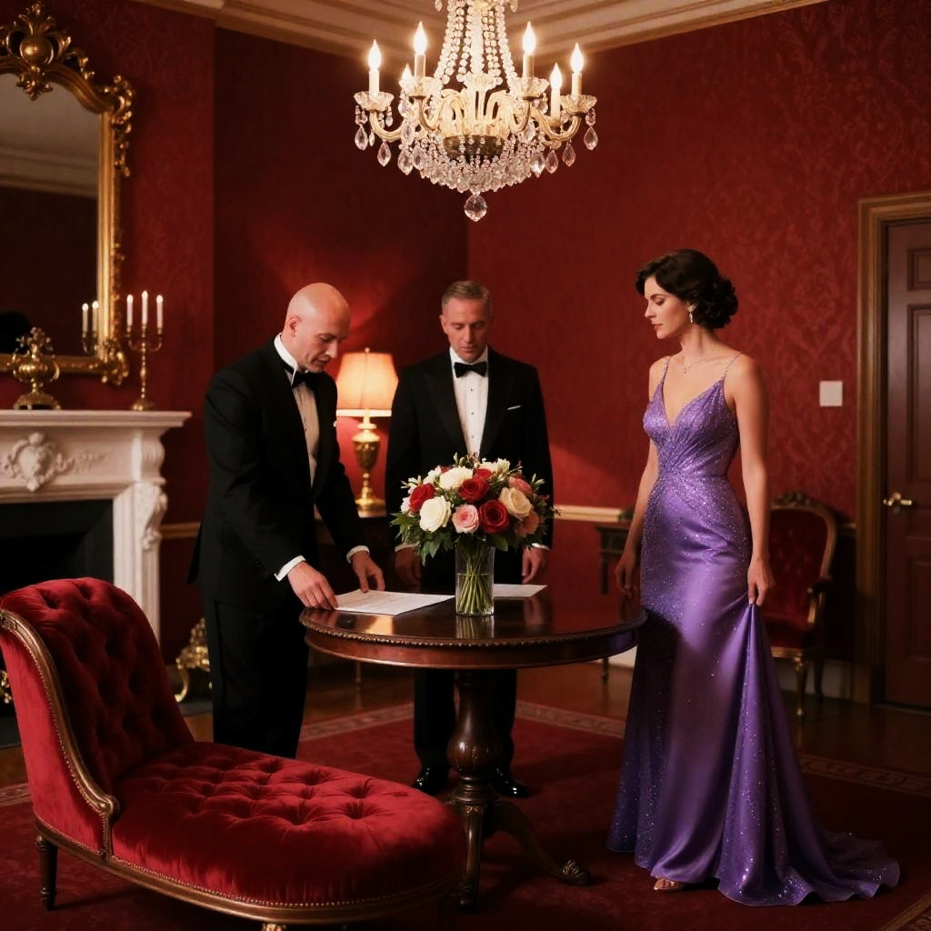 Photograph of an opulent room with red wallpaper and carpet. Woman in a purple, sparkling evening gown stands to the right, holding her dress. Bald man in black tuxedo bends over a round table with a bouquet and papers. Another man in black tuxedo looks down at the table. Crystal chandelier hangs above. Red tufted chaise lounge in foreground. Brass candlesticks on mantel. Warm lamp with orange glow on table.