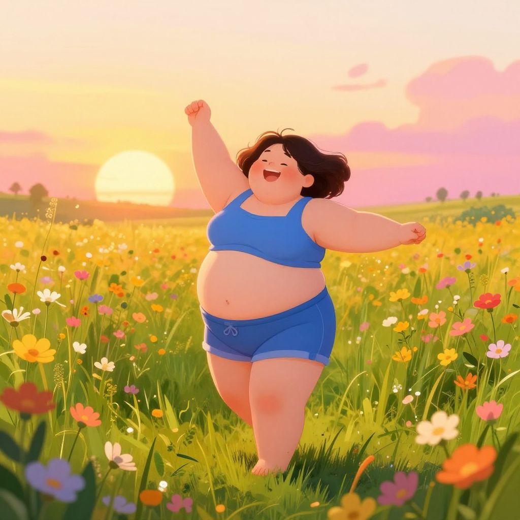 Chubby belly girl dancing happily in a field of wildflowers at sunset, bright vibrant colors, whimsical and dreamy style, detailed floral background, carefree and joyful expression