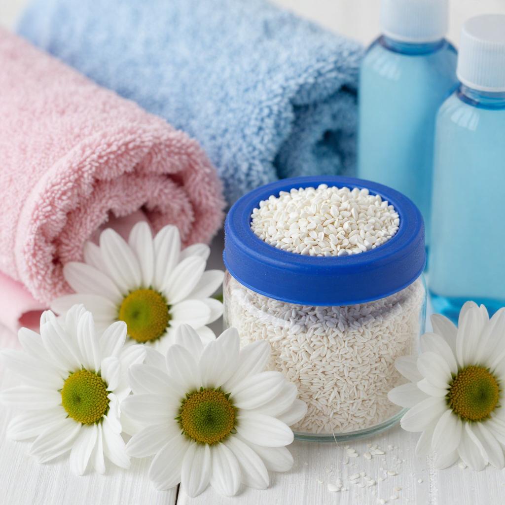 Photograph of a spa-themed setup with a close-up angle. In the foreground, white daisies with green centers are scattered around a blue-lidded jar filled with white grains. Behind, there are folded pink and blue towels, and two blue bottles. The lighting is bright and even, with a shallow depth of field that keeps the flowers and jar in sharp focus while softly blurring the background.
