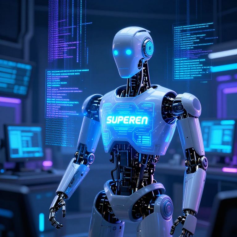 Photograph of a futuristic, white and black humanoid robot with glowing blue eyes and a neon blue "SUPERIOR" sign on its chest. The robot stands in a dark, high-tech laboratory with blue and purple illuminated screens in the background. The robot's joints and mechanical parts are sleek and glossy, with a modern, robotic design. The image has a cyberpunk aesthetic, featuring vibrant digital lights and a futuristic, tech-savvy atmosphere. The robot's stance is confident, with arms slightly bent at the elbows.