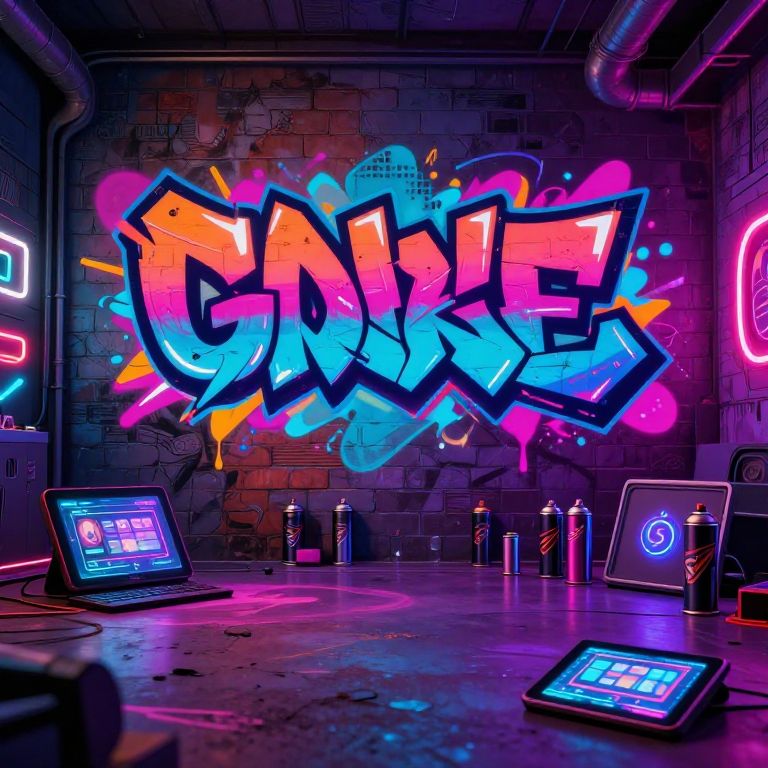 Graffiti font generator interface in a futuristic urban art studio, neon colors glowing on brick walls, digital tablets and spray cans scattered around, vibrant and dynamic style, edgy street art vibe, cyberpunk aesthetic --v 5 --q 2 --ar 16:9