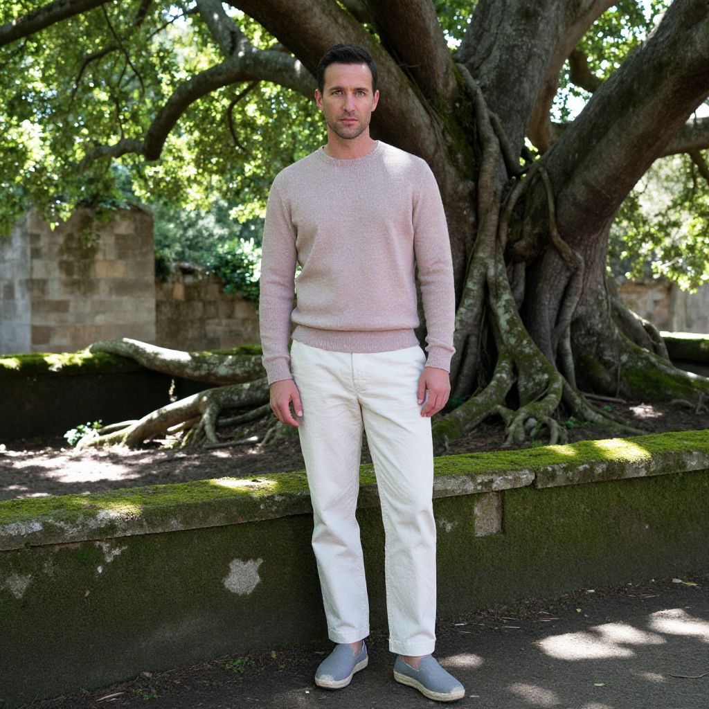 Photograph of a Caucasian man with short dark hair and a trimmed beard, standing outdoors. He wears a light pink, long-sleeve sweater with a subtle pattern, white pants, and gray shoes. He stands in front of a large, sprawling tree with thick, intertwined roots and a stone wall in the background. The ground is paved, and sunlight filters through the tree's leaves, casting dappled shadows. The man's expression is neutral, and his pose is relaxed with arms slightly away from his sides.