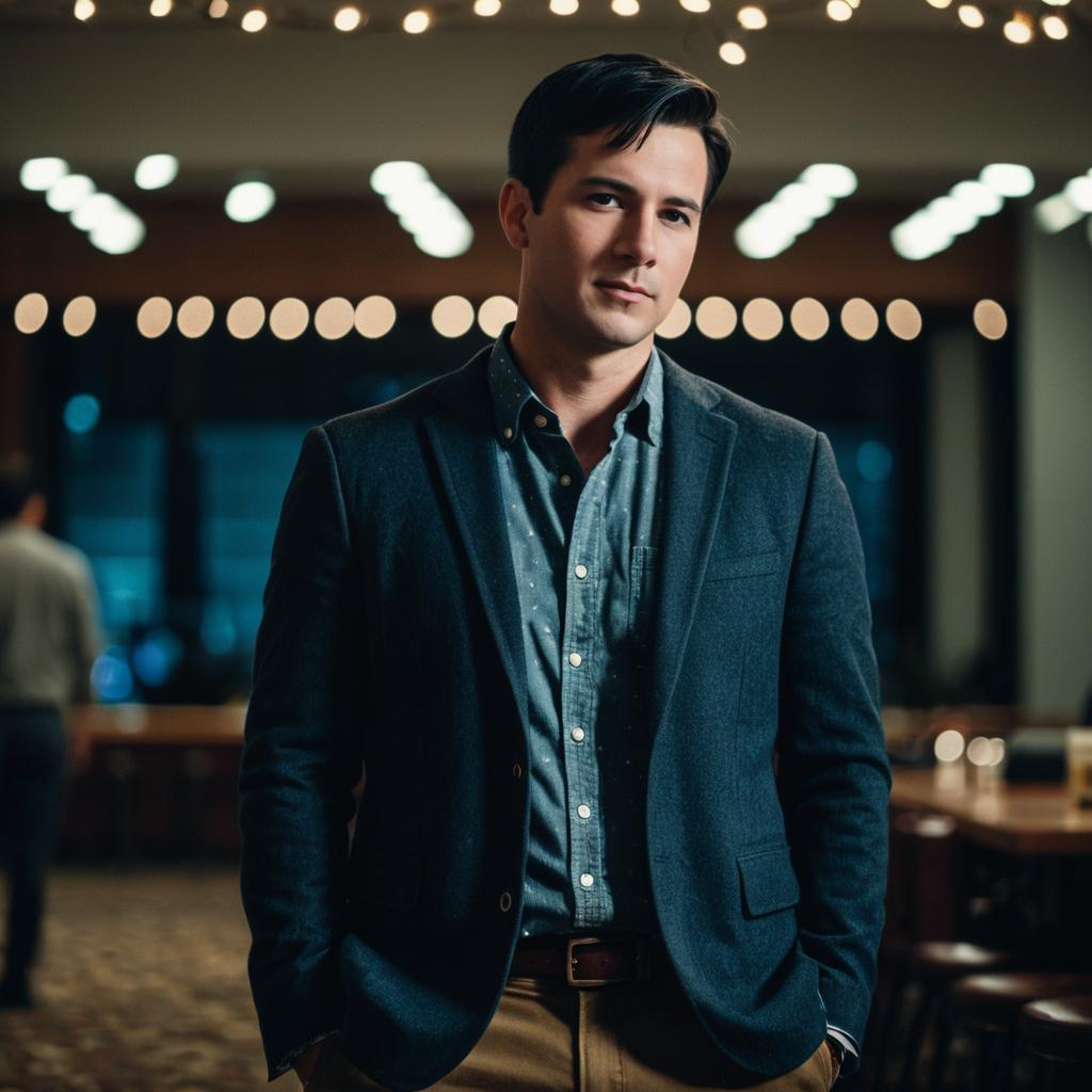 Portrait of a confident man with short dark hair wearing a casual dark blazer over a patterned shirt. The man has a neat groomed look and is standing indoors with soft warm lighting and bokeh effects in the background.