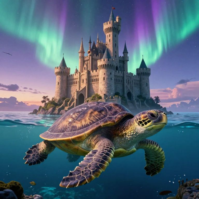 Digital art of a turtle swimming near a fantasy castle under vibrant aurora borealis, with blue and purple lights illuminating the night sky.
