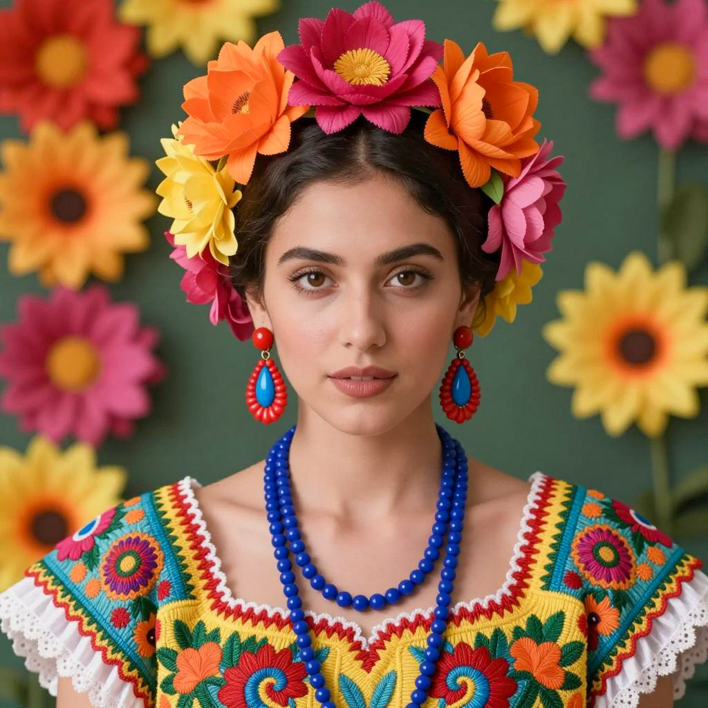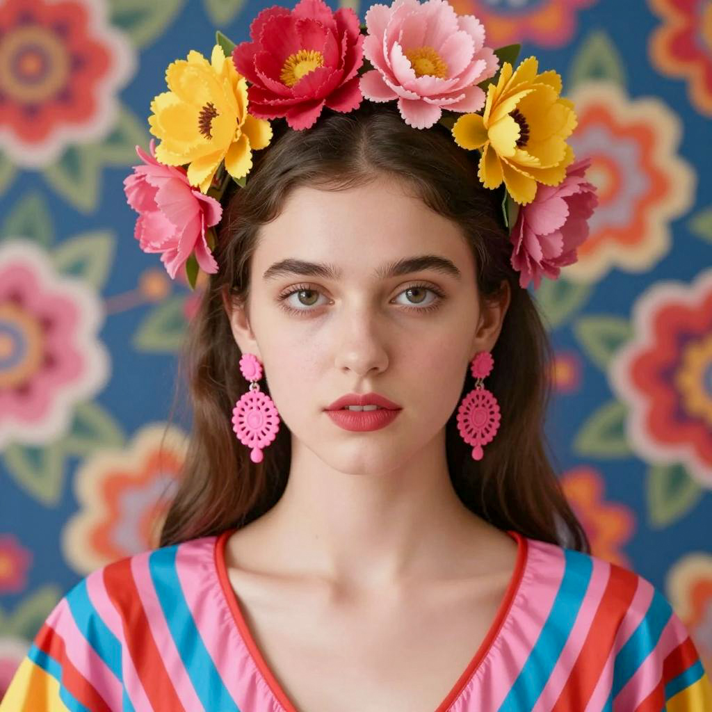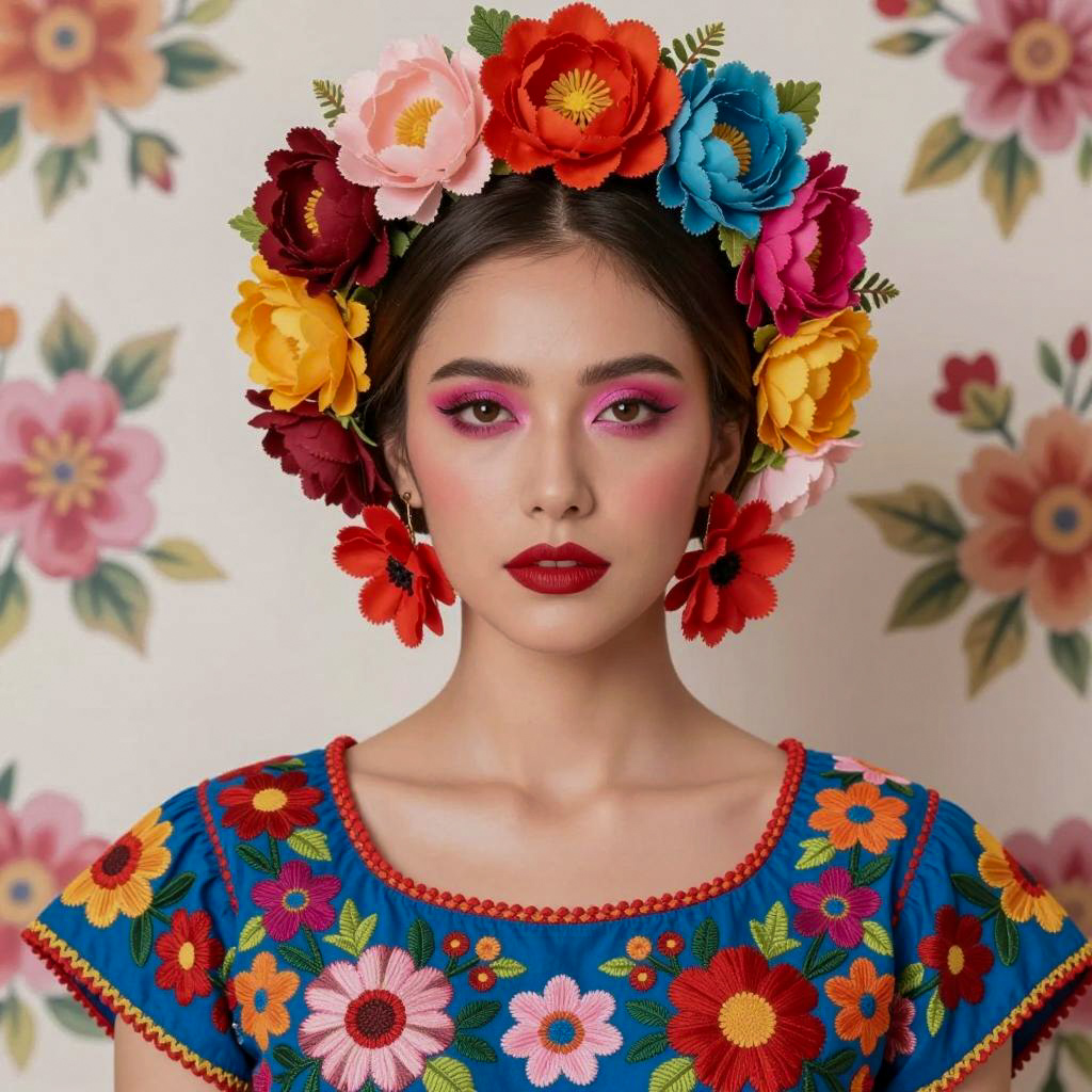 Photograph of a woman with dark brown hair in an orange flower headpiece. She wears a brightly colored orange dress with pink, blue, and purple floral embroidery and sequins. Her makeup is bold with pink eyeshadow and red lipstick. She has a necklace with pink and blue beads and dangling pink and blue earrings. The background features a vibrant blue with large pink and orange flowers. She stands facing the camera with a neutral expression. The image has a rounded white border.