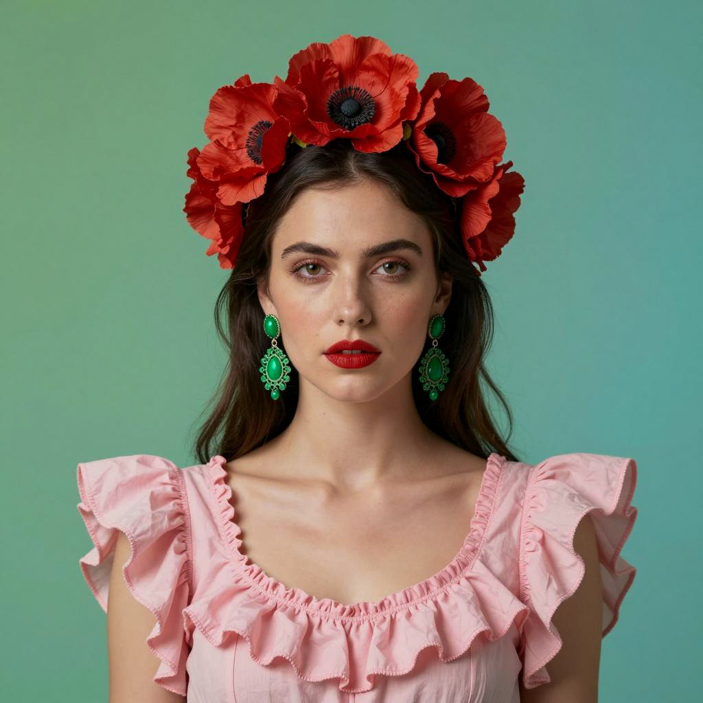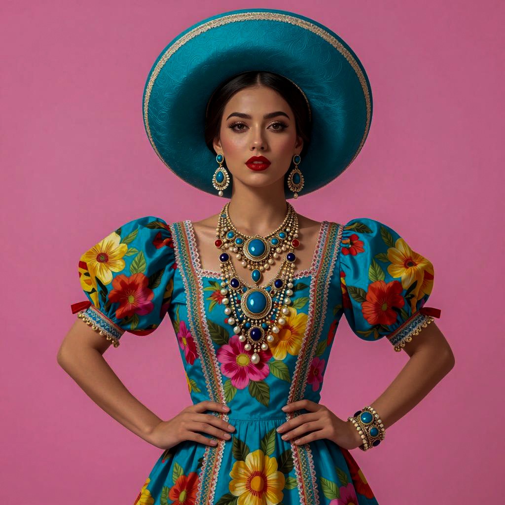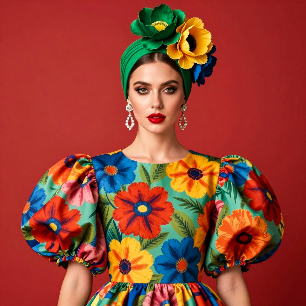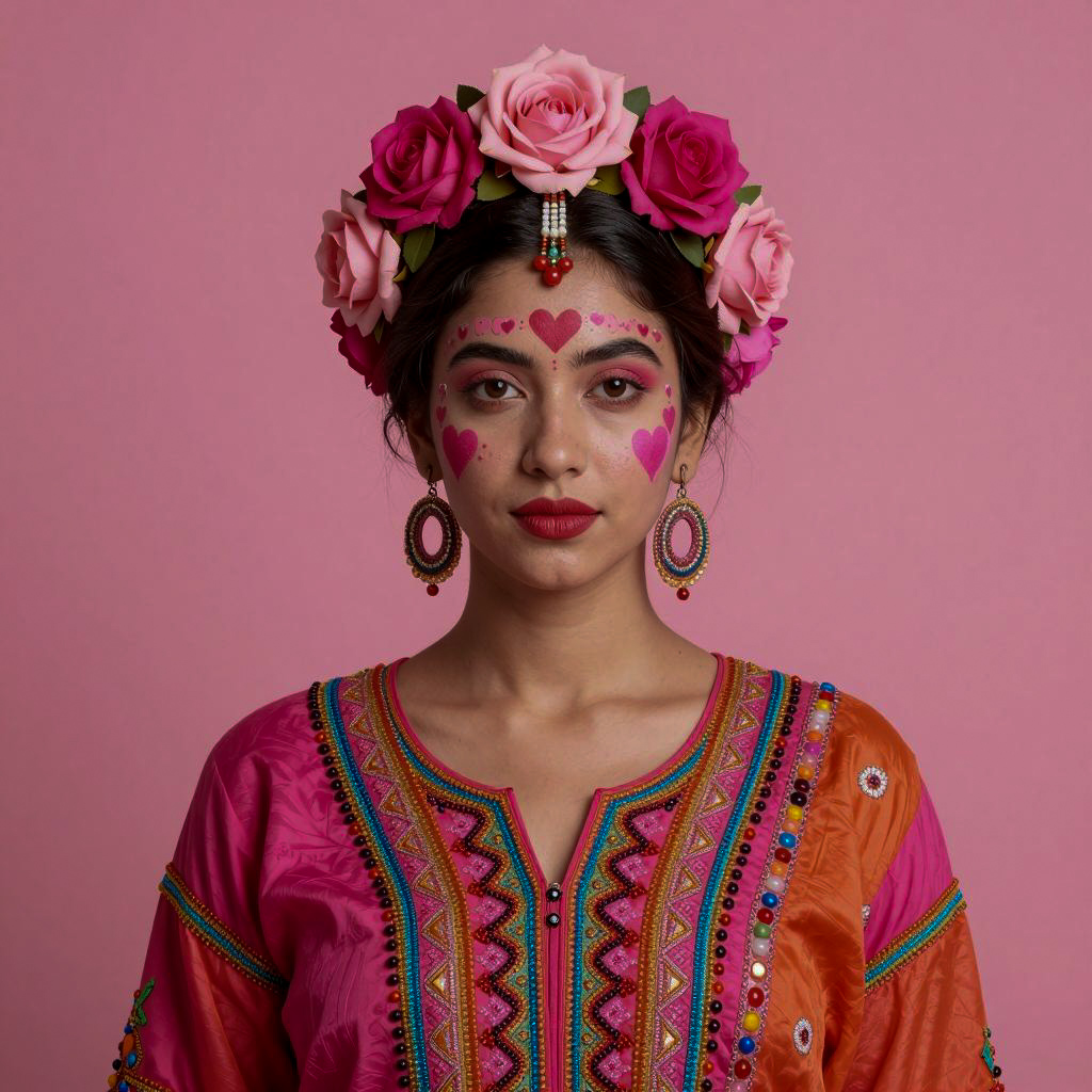 Photograph of a woman with dark brown hair in an orange flower headpiece. She wears a brightly colored orange dress with pink, blue, and purple floral embroidery and sequins. Her makeup is bold with pink eyeshadow and red lipstick. She has a necklace with pink and blue beads and dangling pink and blue earrings. The background features a vibrant blue with large pink and orange flowers. She stands facing the camera with a neutral expression. The image has a rounded white border.