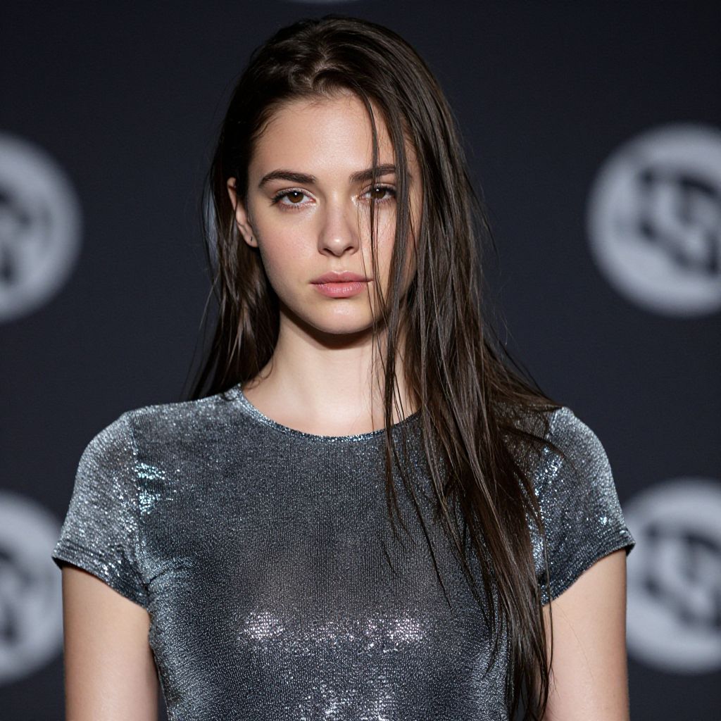 Photograph of a young woman with wet, dark brown hair partially covering her face. She has a fair skin tone and is wearing a shimmering, gray, short-sleeved top that catches the light. Her makeup is subtle, with a natural look. She stands against a dark, blurred background with white, circular patterns. Her expression is calm and confident. The lighting highlights the sparkle of her top.