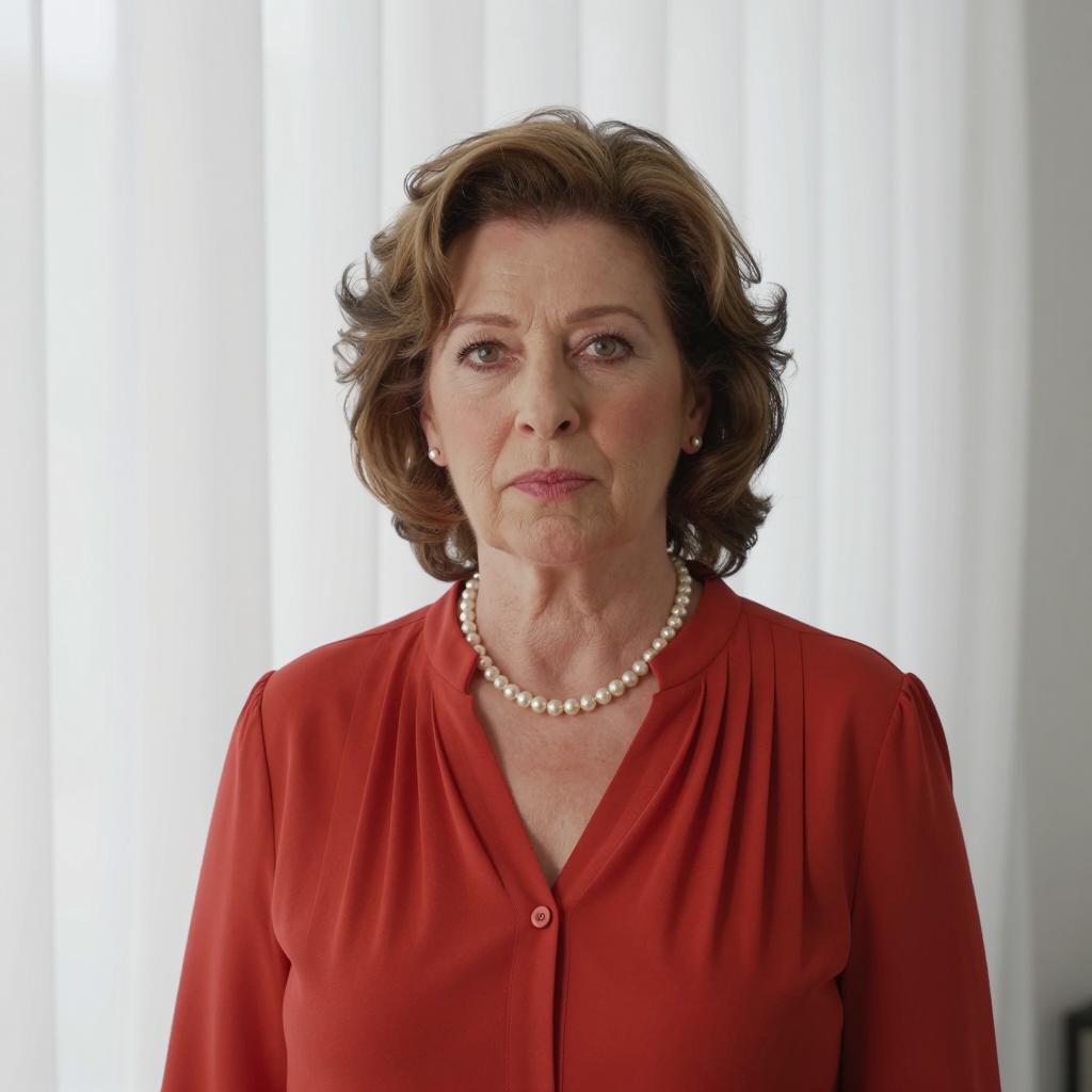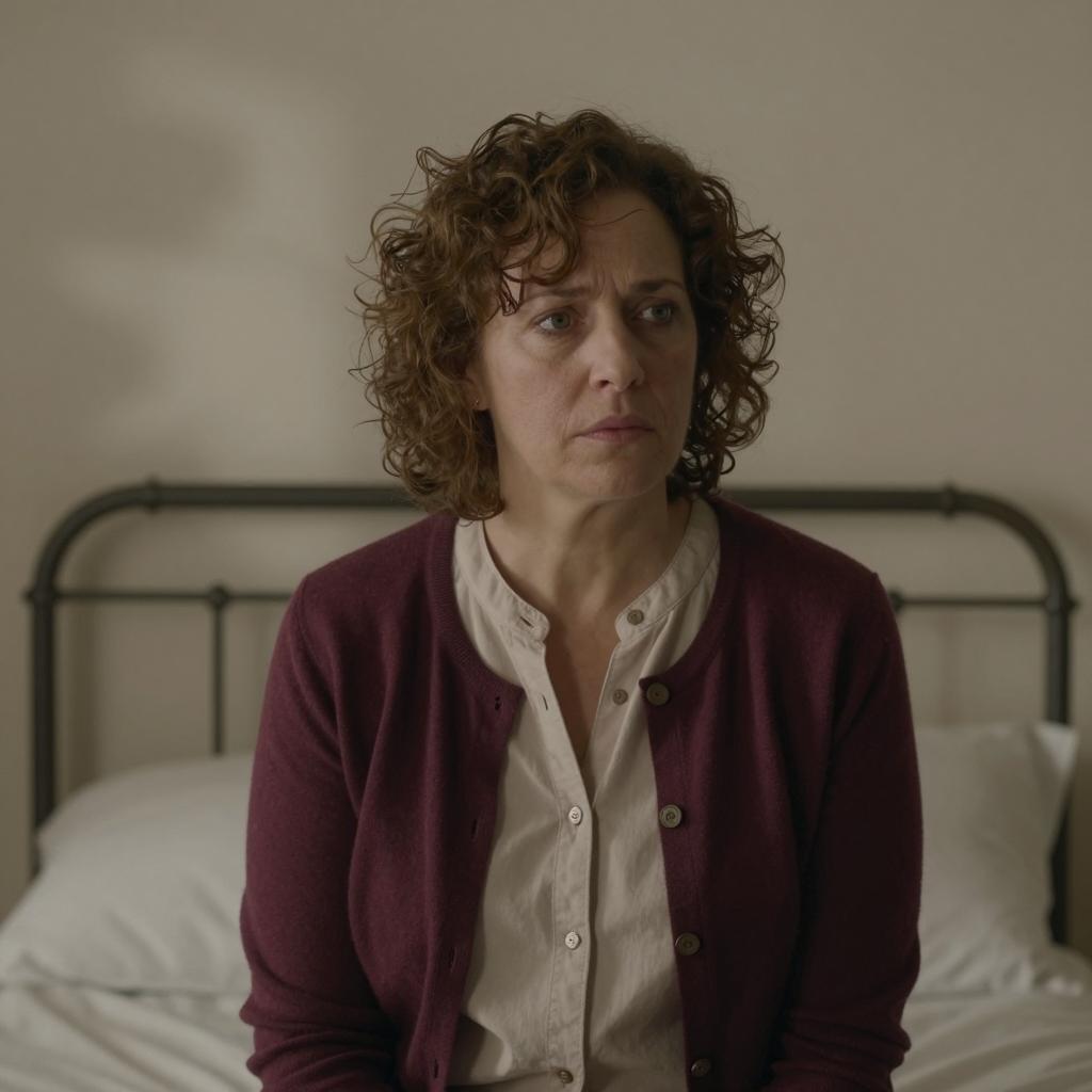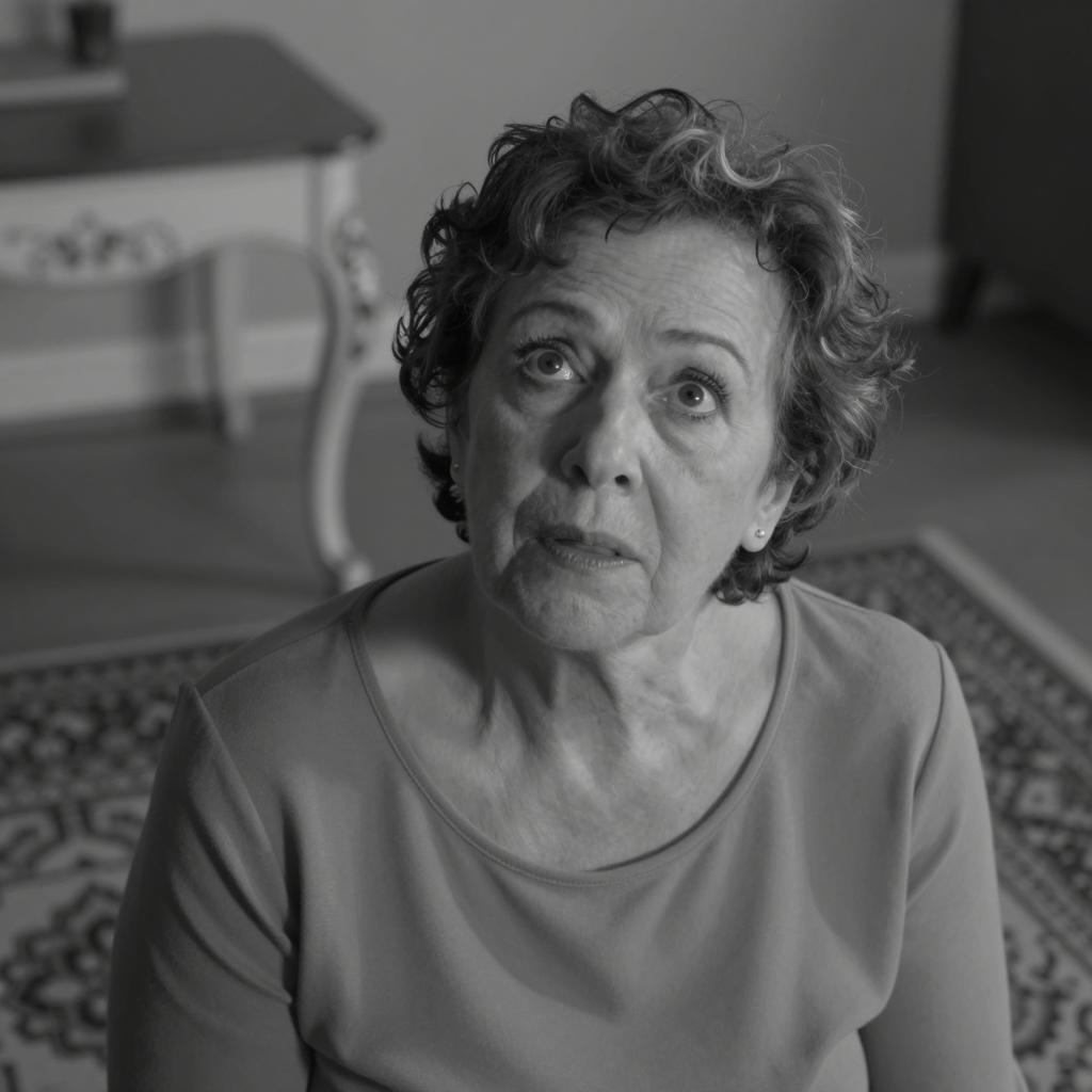 Close-up photograph of an elderly woman with pale skin, red curly hair, green eyes, and visible wrinkles. She has a worried expression with slightly parted lips. She wears a light purple shirt. The background is blurred and dark.