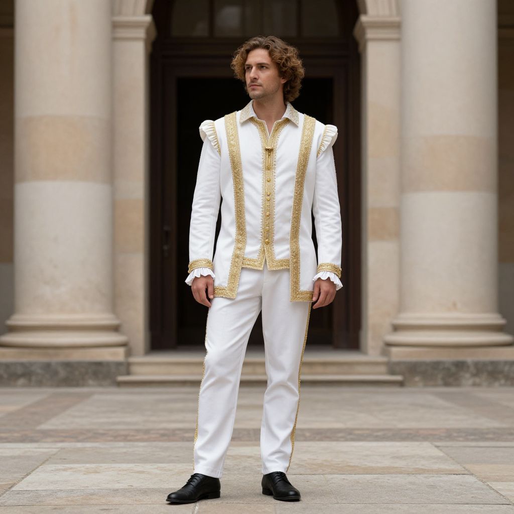 Renaissance Costume, man in a white and gold costume standing in front of a building