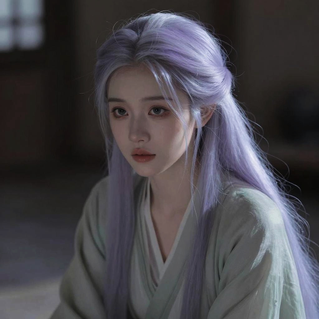 Soft anime‑style digital painting of a beautiful young woman in her thirties with long flowing icy lavender with silver streaks hair and expressive eyes, wearing a draped muted sage garment, gently illuminated by diffused light in a muted, enclosed setting, her gaze direct and emotional, detailed facial features and soft textures with pastel highlights, conveying a mood of quiet vulnerability and intimacy