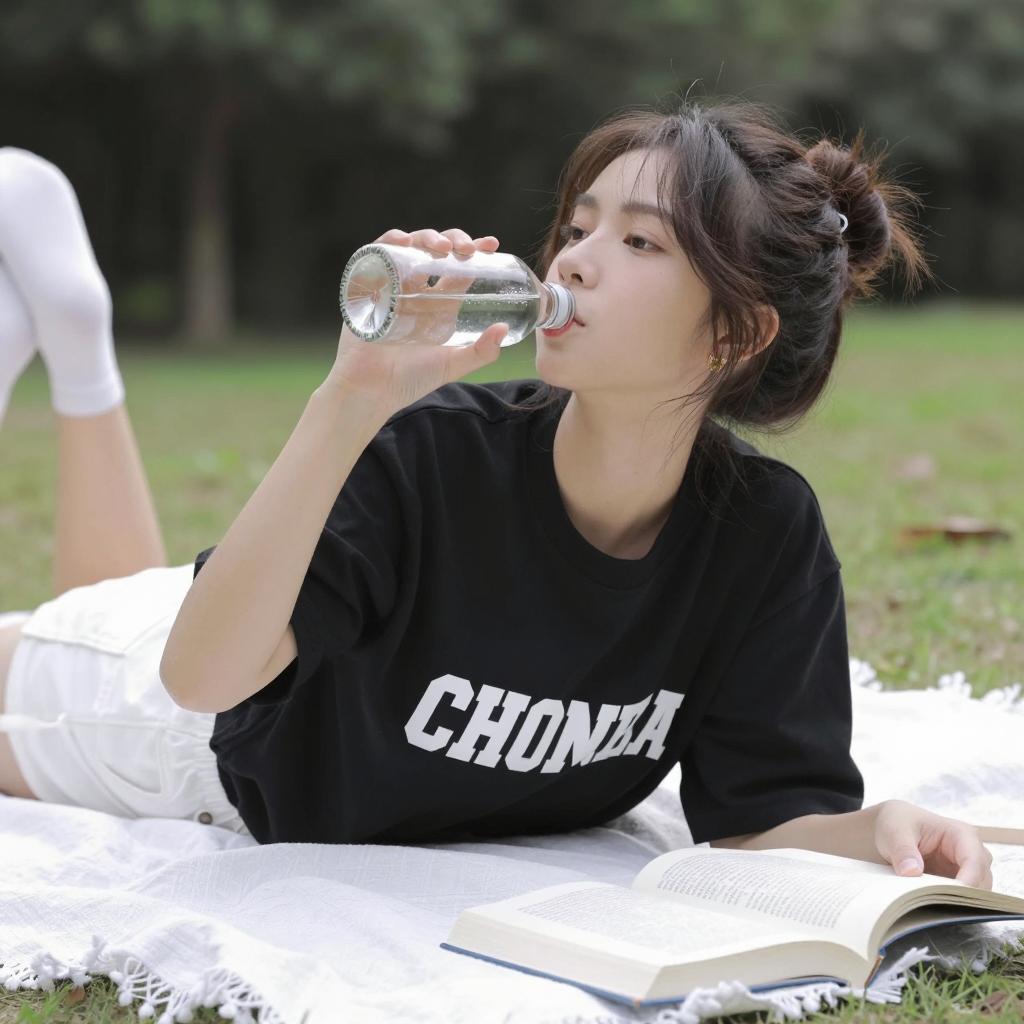 Young woman with light skin and dark hair in a messy bun, lying on a white blanket outdoors. She drinks from a clear glass bottle, holding it with her right hand. She wears a black T-shirt with white and white shorts. Her left hand holds an open book on her lap. Background has green trees and bushes. She wears small gold earrings. Her expression is neutral. Natural light.