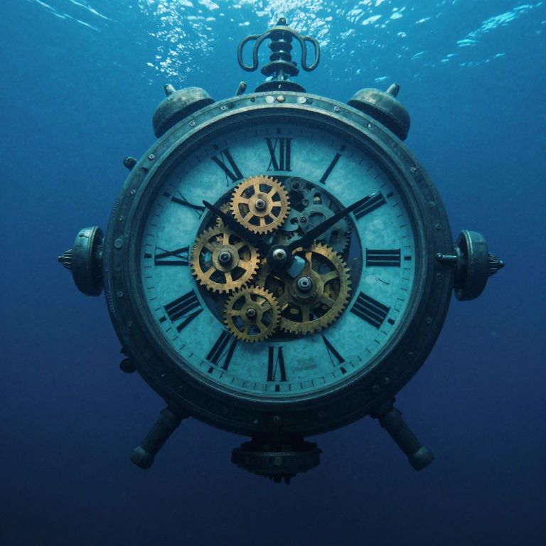 Enveloped in the quiet embrace of the deep, a colossal mechanical clock with living gears hums beneath the ocean's surface, its rhythmic ticking resonating like a forgotten heartbeat, whispering the eternal dance of time and the silent mysteries of the abyss.