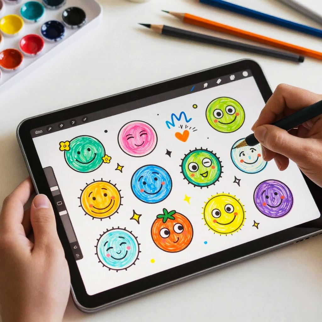 Doodle maker creating whimsical sketches on a digital tablet, vibrant colors, playful lines, creative workspace background, art tools scattered around, lively and imaginative atmosphere, casual and fun style