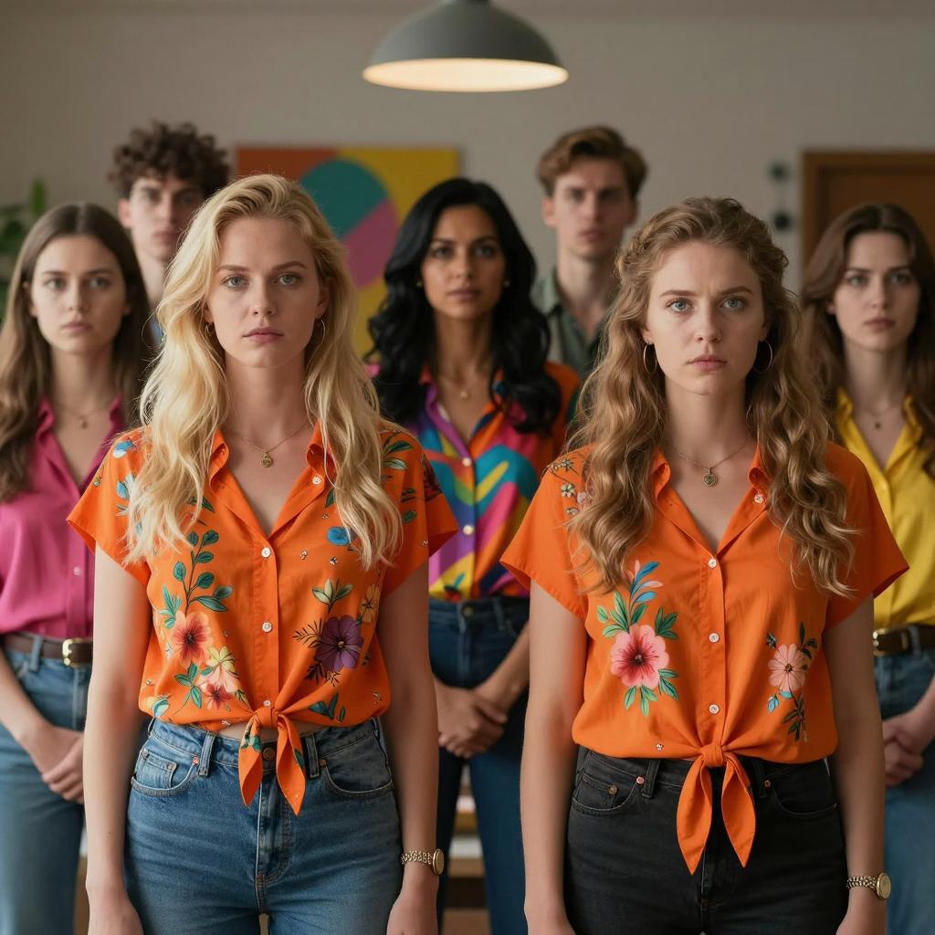 Group of 12 people in a dimly lit room with multicolored curtains. Red, yellow, and green lights. People have varied appearances and clothing styles. One man with dreadlocks in green jacket on left, woman with curly red hair in white tank top center, man with beard and tank top to her right. People seated and standing, serious expressions. Background includes small lights and curtains.
